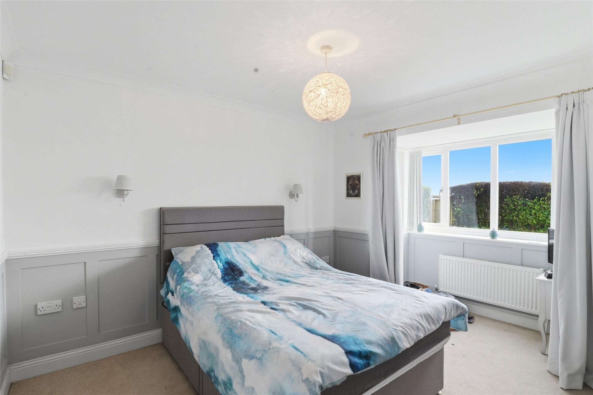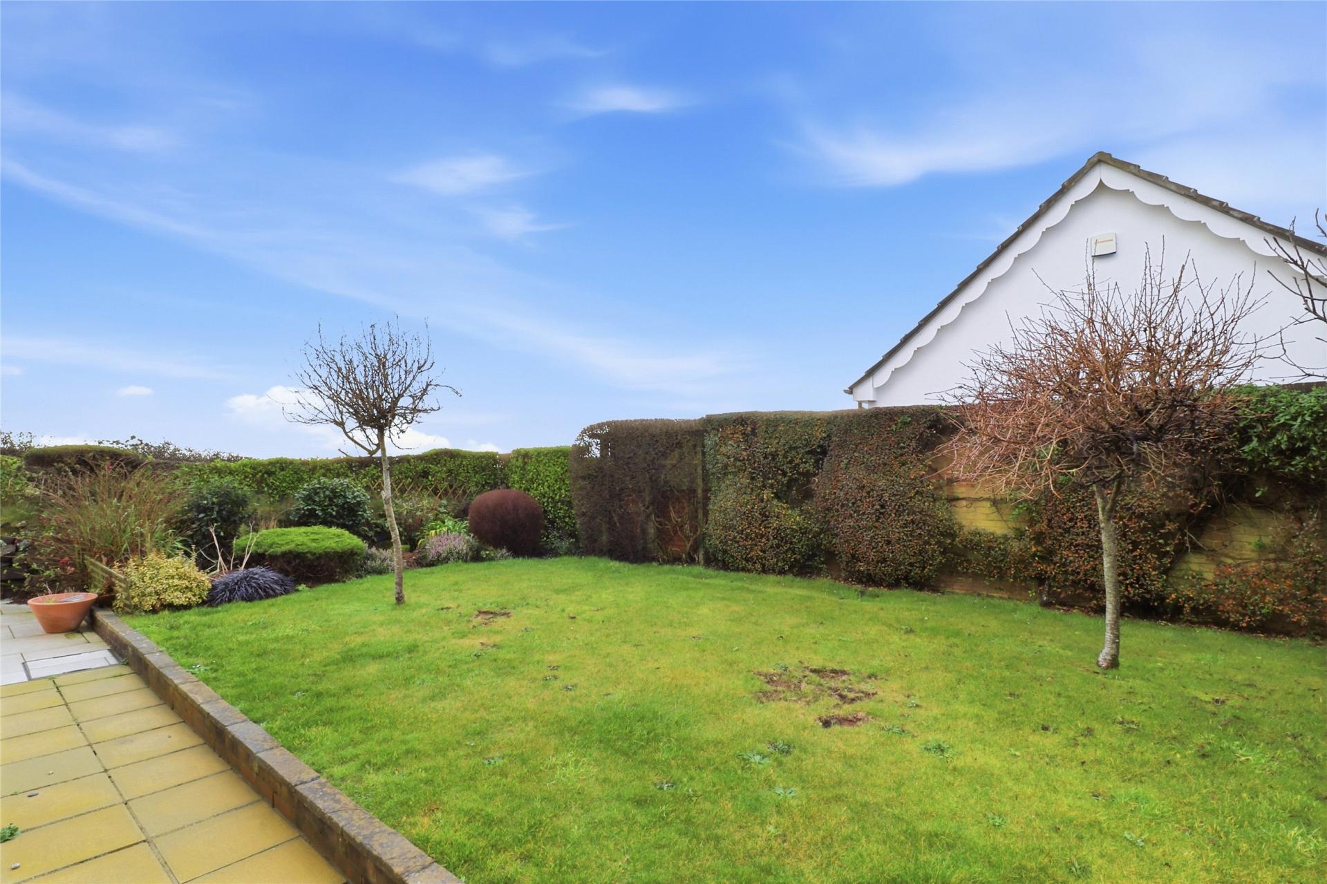 Externally, the bungalow enjoys a wrap-around garden. From the kitchen, doors lead out onto a contemporary and extensively paved patio area, ideal for outdoor dining, which continues around to a level lawned garden bordered by mature greenery, shrubs and plants, providing both privacy and an attractive outlook.