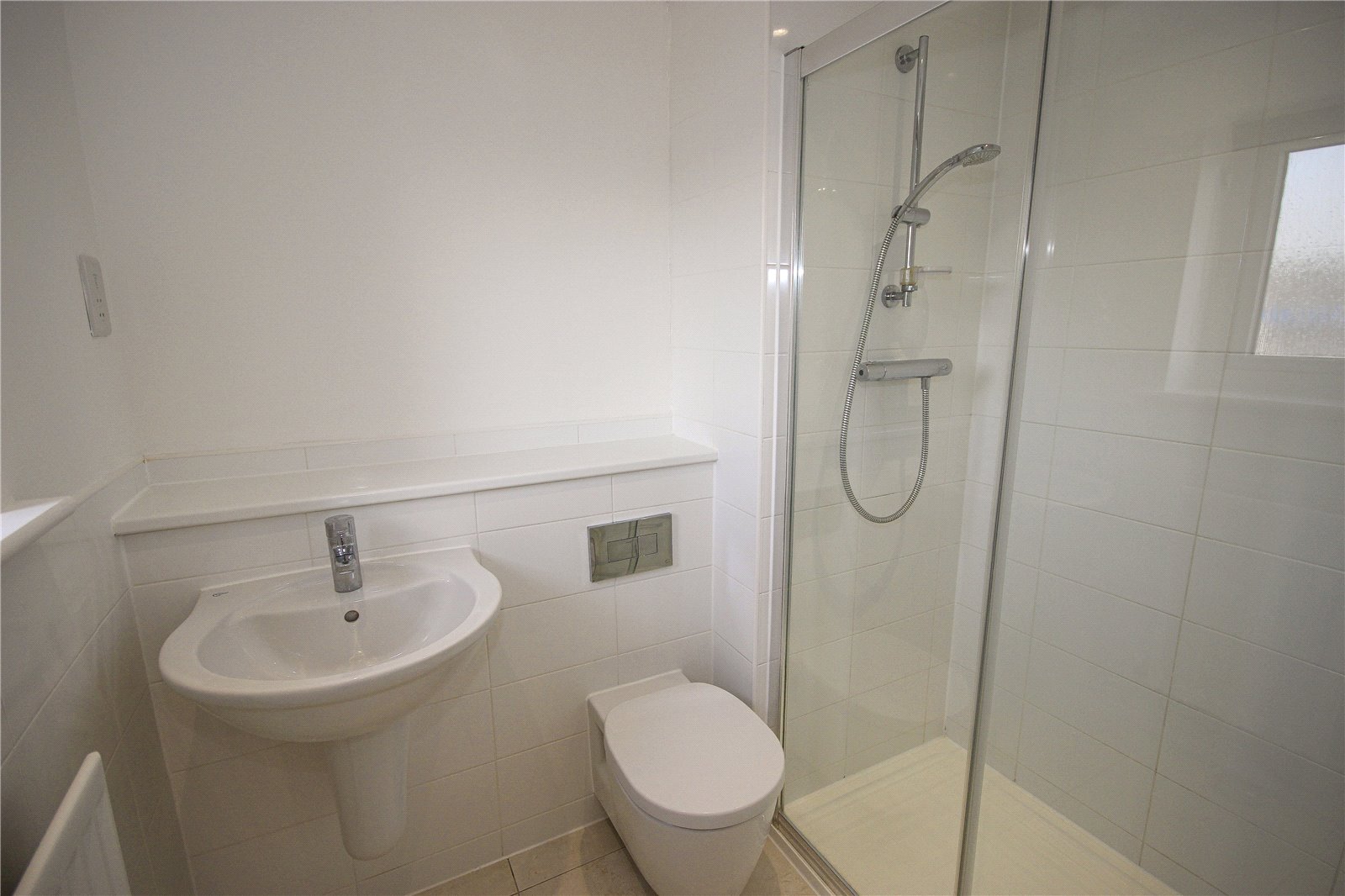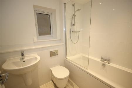 The family bathroom is mostly tiled with WC, wash hand basin, heated towel rail and bath with mains shower over.