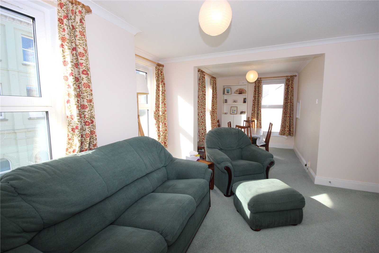 living room/dining room which spans the length of the apartment. This dual aspect room is light and airy and benefits from a bay window which provides views up Beach Road toward the sea and seafront. This room also has a stone fireplace with inset gas coal effect fire and ample space for a dining table and chairs.