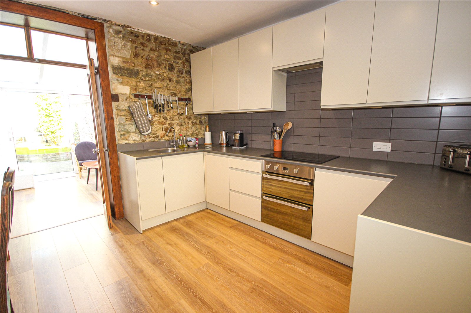 The front door opens into the entrance hallway with stairs rising with attractive balustrading and decorative floor tiling with cloaks hanging. An internal latch door opens into a large open plan living/dining/kitchen with the living area at the front of the property with a large sash window. Wood effect flooring, flows through the entire room and into the rear sun room. The dining area has plenty of space for a table and chairs and the well fitted kitchen has a matching range of base and wall units with grey worktops with complementary coloured tiling with inset sink and incorporates a built-in oven with hob over and extractor fan above, under-unit fridge, and an integrated dishwasher. There is lovely, exposed stone walling to the end of the room with French doors opening to a lovely bright and airy sunroom. Again, this room has feature stone walls and polycarbonate roofing which creates a lovely bright room. Sliding patio doors look out to the rear garden.