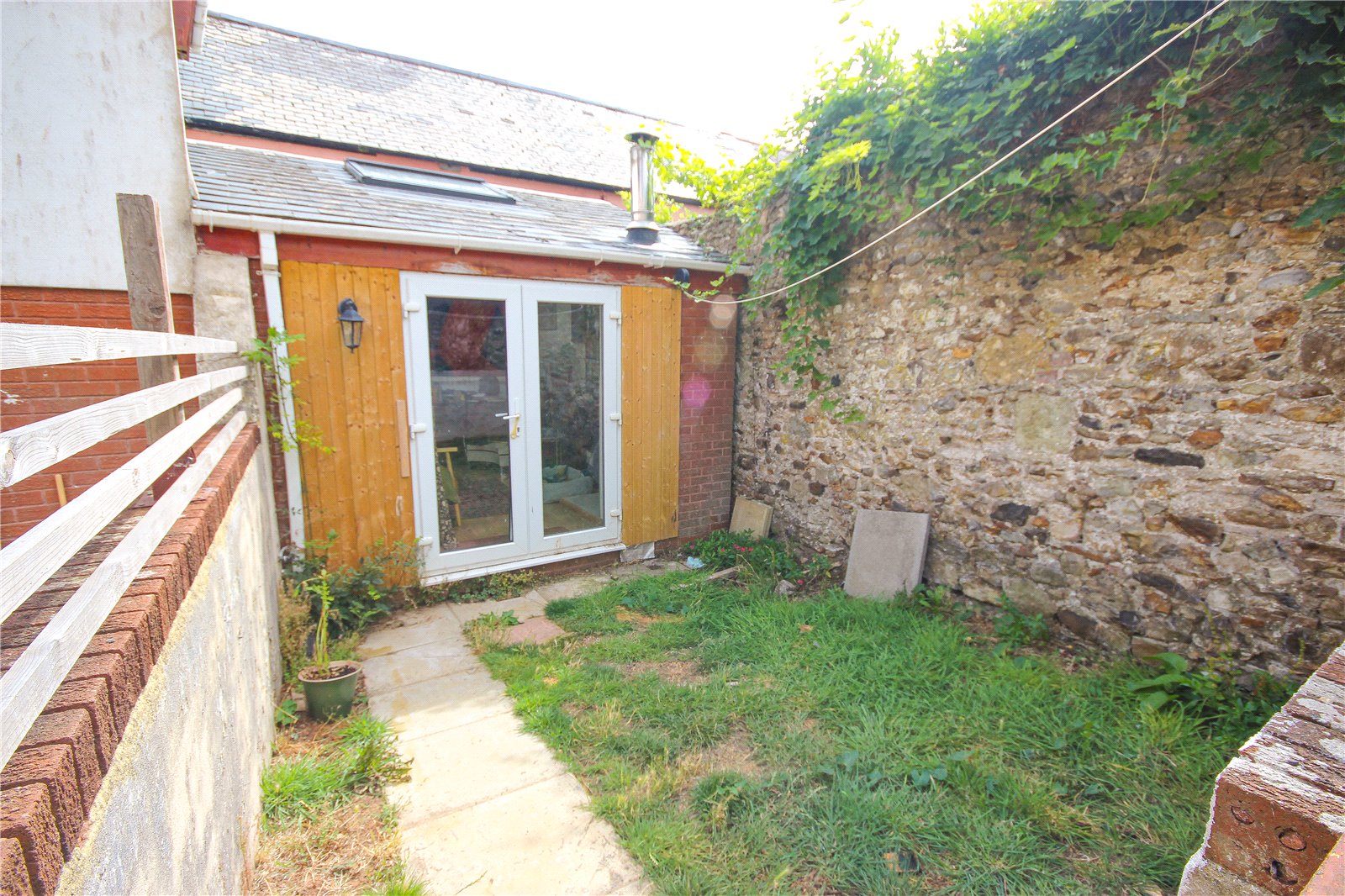To the front, there is hardstanding with off-road parking for several vehicles. A side driveway leads to the rear of the property, where a spacious open area is framed by a historic stone wall. Part of this rear space is currently divided into two garden areas, one for each apartment (see site plan for details).