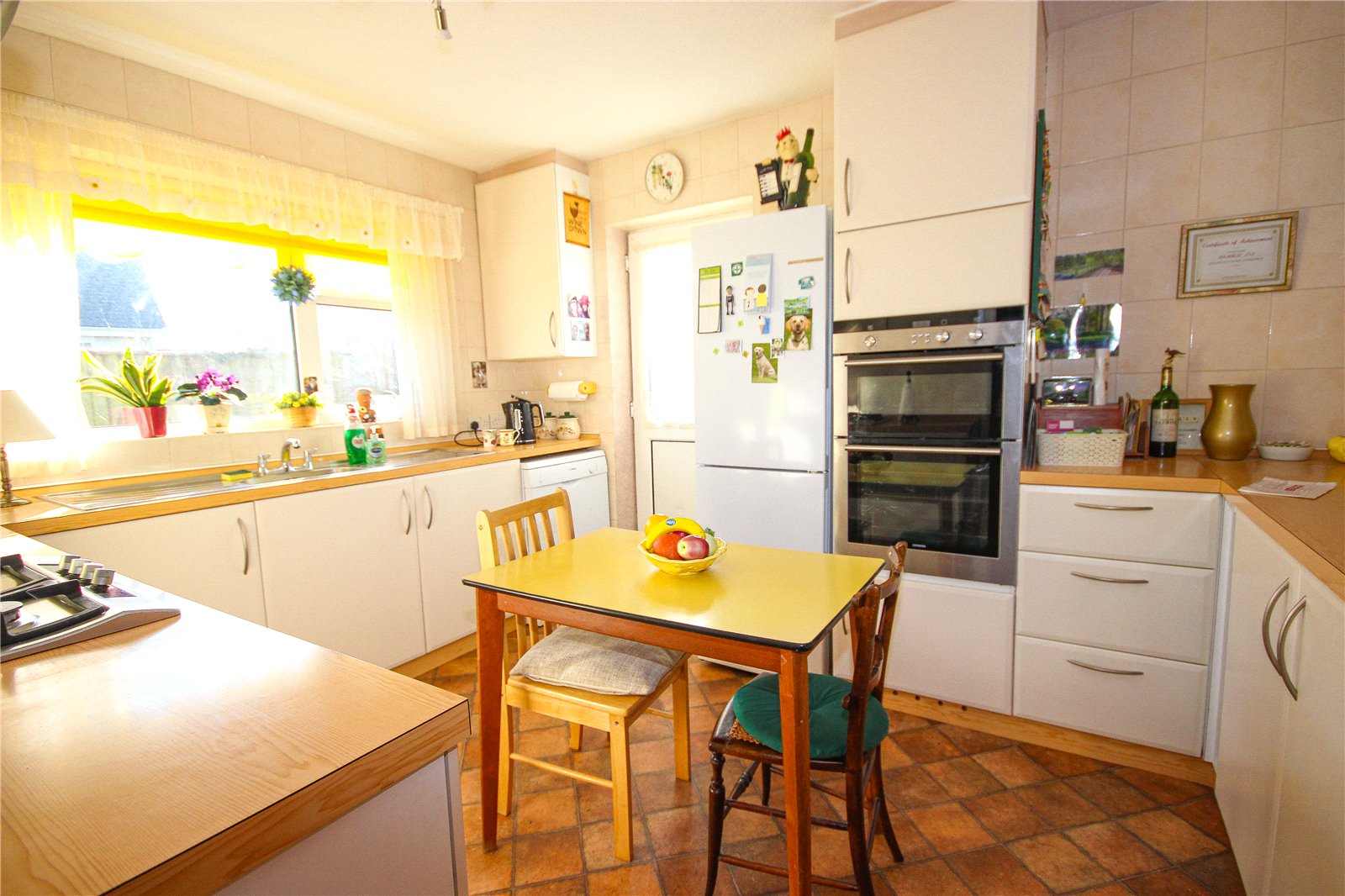 The kitchen/breakfast room is fully fitted with laminate flooring, a range of matching base and wall units, tiled splashback, worktops and sink. There is an integrated gas hob with extractor over and integrated double oven, alongside space and plumbing for an undercounter dishwasher and space for a tall fridge freezer. A door from the kitchen leads out to the rear garden.