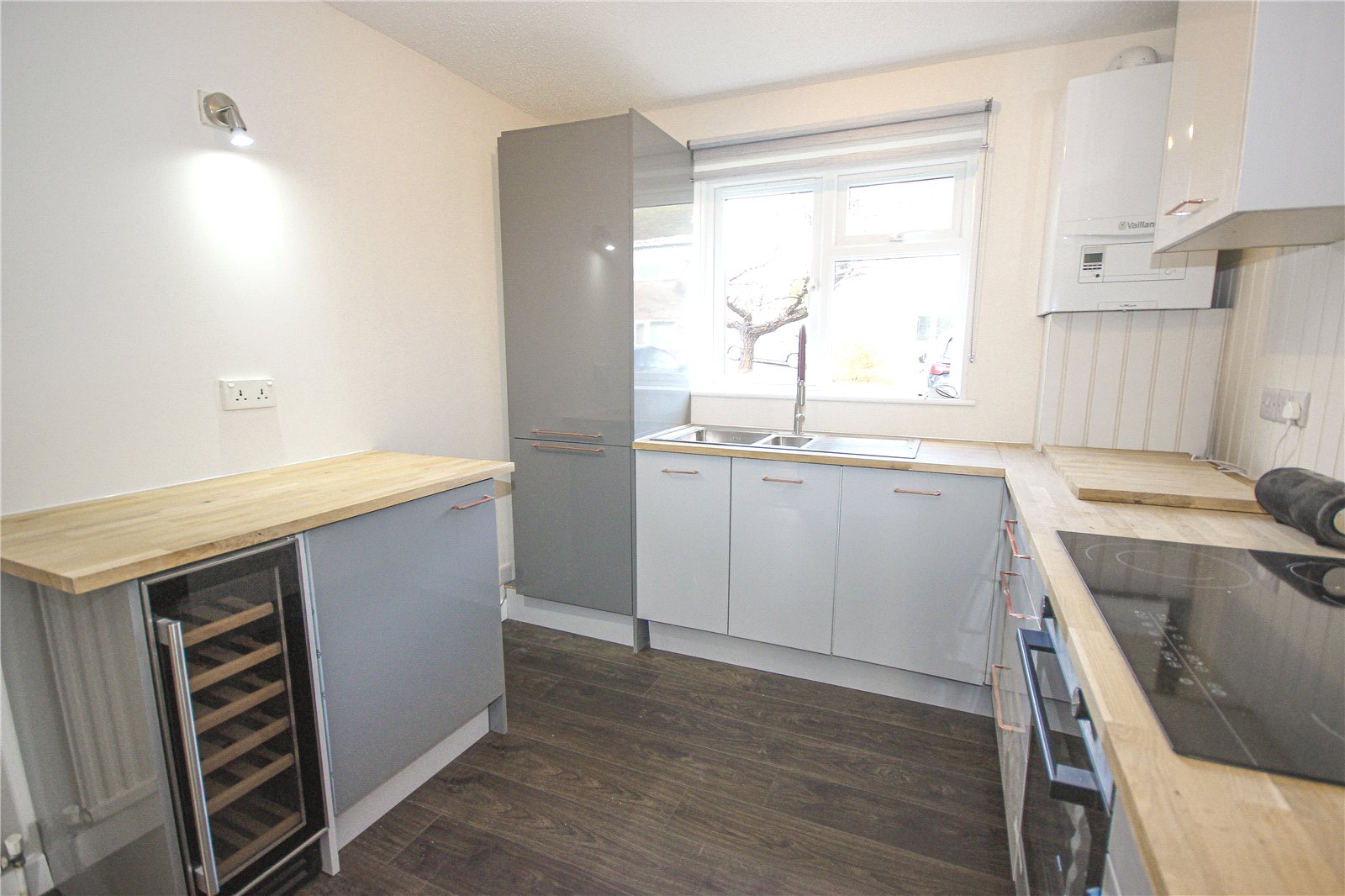 The living room is spacious and bright, with a dual aspect facing on to Riverdale beyond. The kitchen has been comprehensively fitted with a contemporary kitchen with a range of complimentary grey tone gloss base and wall units with rose gold handles, wooden worktops and sink. There is a built in oven with large ceramic electric hob over, integrated tall fridge freezer, wine cooler and built in washing machine.