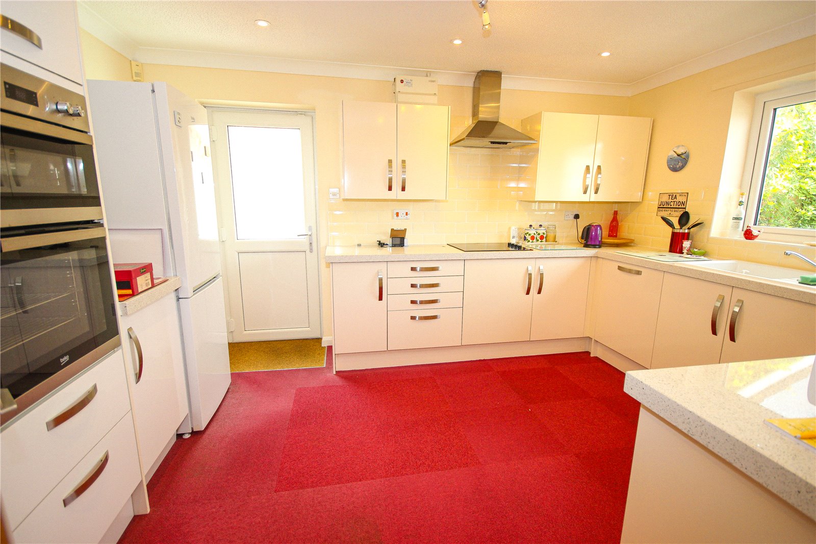 the front window has the same views as well as looking through the valley, straight to the sea. It is a good-sized room with a feature marble style fireplace with inset gas coal effect fire. In the entrance hall there are three storage cupboards, one which is the airing cupboard with slatted shelves and housing the hot water cylinder. At the rear of the bungalow there is a nice square dining room which has a door off to conservatory to rear and door to the left opening to good sized kitchen. The kitchen has a range of matching base and wall units with quartz effect worktops, sink with electric hob and extractor over, built-in oven, integrated dishwasher and space for upright fridge freezer. A desk area has been created in the corner of the kitchen using the same worktops and is ideal for computer use and there is a side door which accesses the driveway in front of the garage. The conservatory is a good size with sliding patio door and windows all around with pitched glazed roof. This room enjoys lovely views across the Axe Estuary and countryside in the distance.