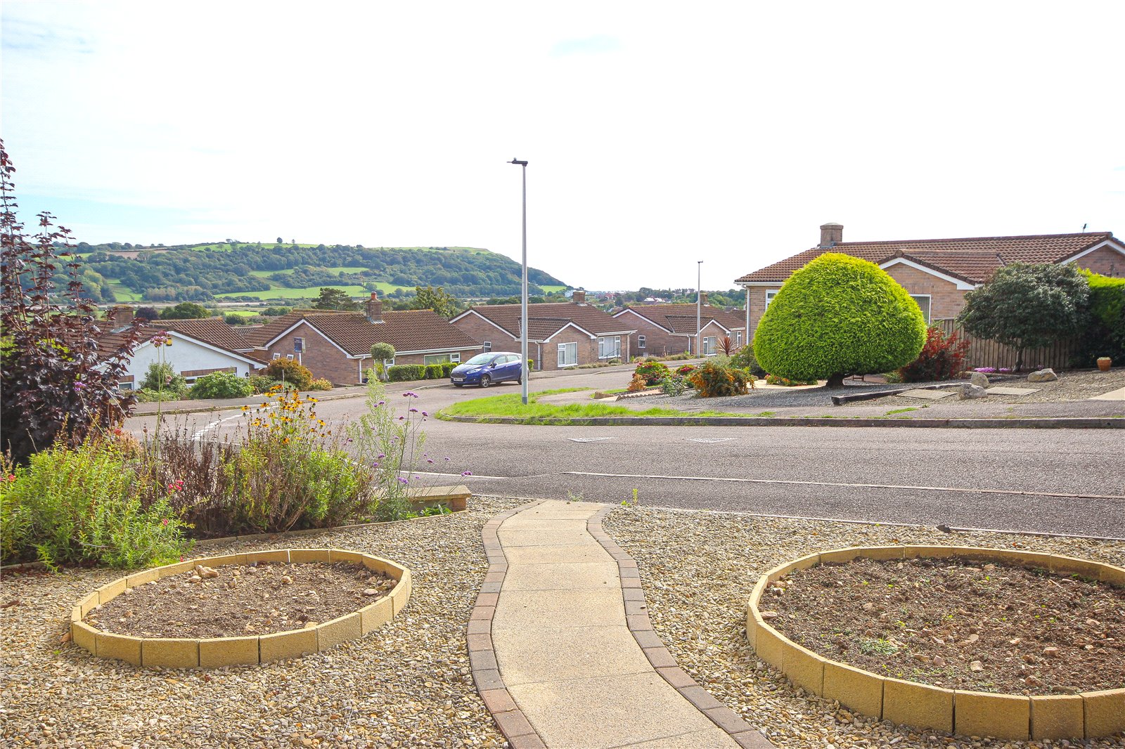 The front garden is fully landscaped with ease of maintenance in mind with gravelled areas interspersed with flower and shrub borders. and a pathway running through to the front door. There is a small paved area immediately adjacent to the front of the property, suitable for sitting out and enjoying the fabulous view across the valley towards the sea and Estuary. To the left hand side of the property is a driveway providing parking for two vehicles in front of the attached garage and to one side of the property is a pedestrian gate leading, giving access to the rear gardens.