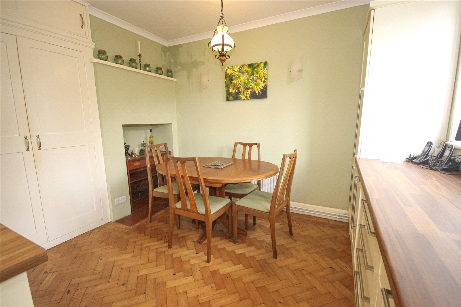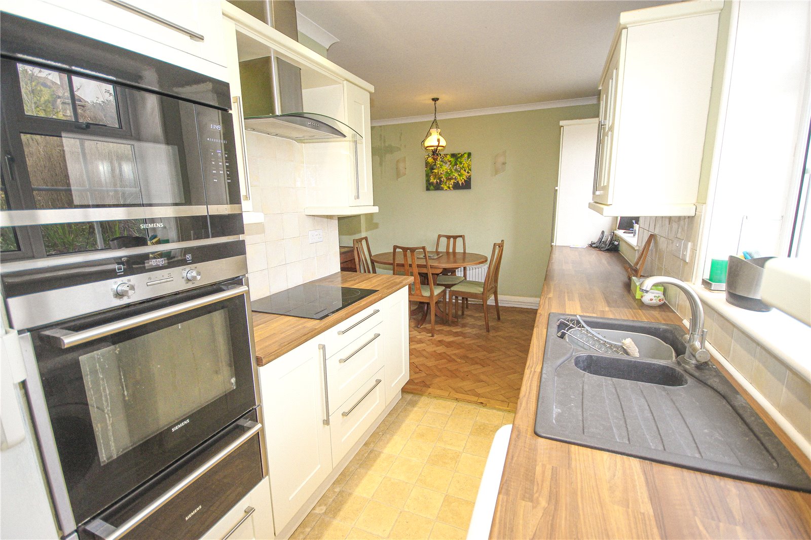 The kitchen diner is a well-proportioned room with original built in larder cupboard, a range of cream shaker style base and wall units, laminate worktops and sink. There is an integrated Siemens ceramic hob with extractor over, alongside fitted double oven and microwave, plus space for a tall fridge freezer, washing machine and dishwasher. The gas central heating boiler is also situated in the kitchen. A door provides access to the rear garden.