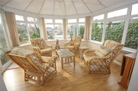 There is a separate dining room, with an original brick fireplace opening, with an open square arch leading into a large conservatory with windows to all sides and French doors overlooking the front garden, driveway, and distant views beyond.