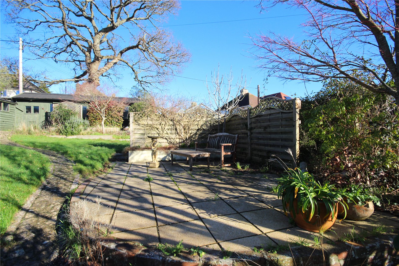 To the top of the garden is an area for vegetable beds alongside a wooden shed, large greenhouse and a large worktop/store with sliding wooden doors providing plenty of work or storage space.