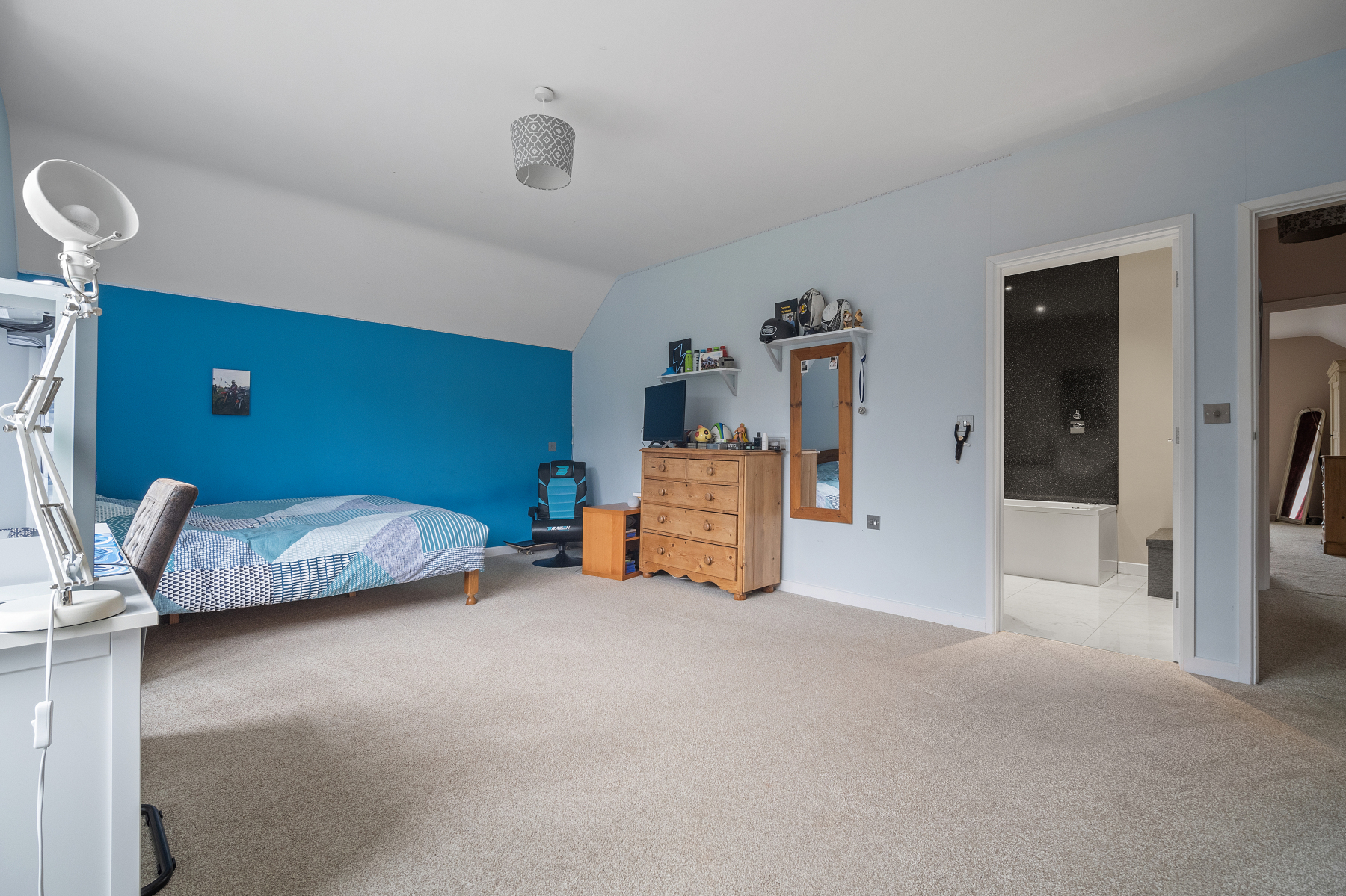 Back to the hallway, the stairs rise to the first floor and landing. With its two front aspect windows it allows light to flood in and connects the upstairs accommodation beautifully. The PRINCIPAL BEDROOM is so much more than just a bedroom. It is your own private suite offering two built in double wardrobes and fantastic far-reaching views from the comfort of your own bed. Why not enjoy breakfast and embrace the outdoors on your own personal glass fronted balcony, taking in the sensational sights and sounds of the country. The principal ensuite is fitted with a double heated towel rail, double shower, twin sinks, illuminated mirror, W.C, tiled flooring and has a window to the side aspect.