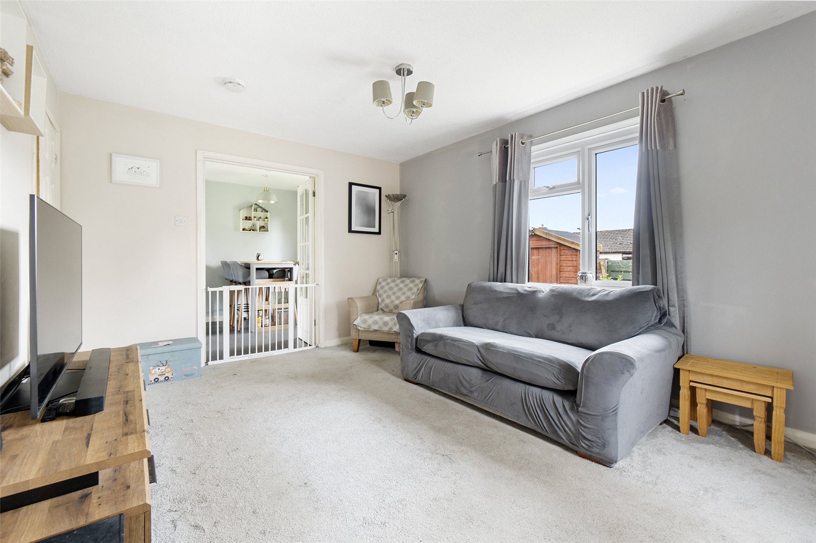 Lounge 14'2" (4.31m) x 10'11" (3.33m) narrowing to 10'3" (3.12m). A dual aspect double glazed windows to the front and side, wall mounted electric radiator, understairs storage cupboard, television point and double doors opening into kitchen/diner.