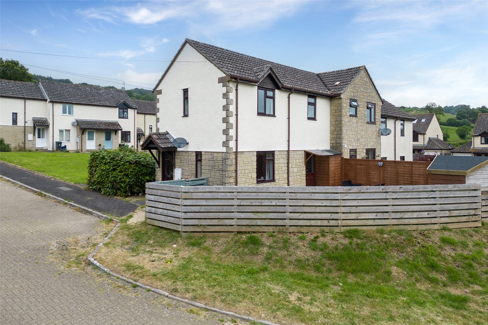 Outside There is a small garden to the front mainly laid to mature hedging with path to main entrance door and gate into garden. The garden is laid to the side of the property mainly laid to lawn with a paved pathway leading to a paved seating area giving access to a wooden storage and also access to the kitchen door.