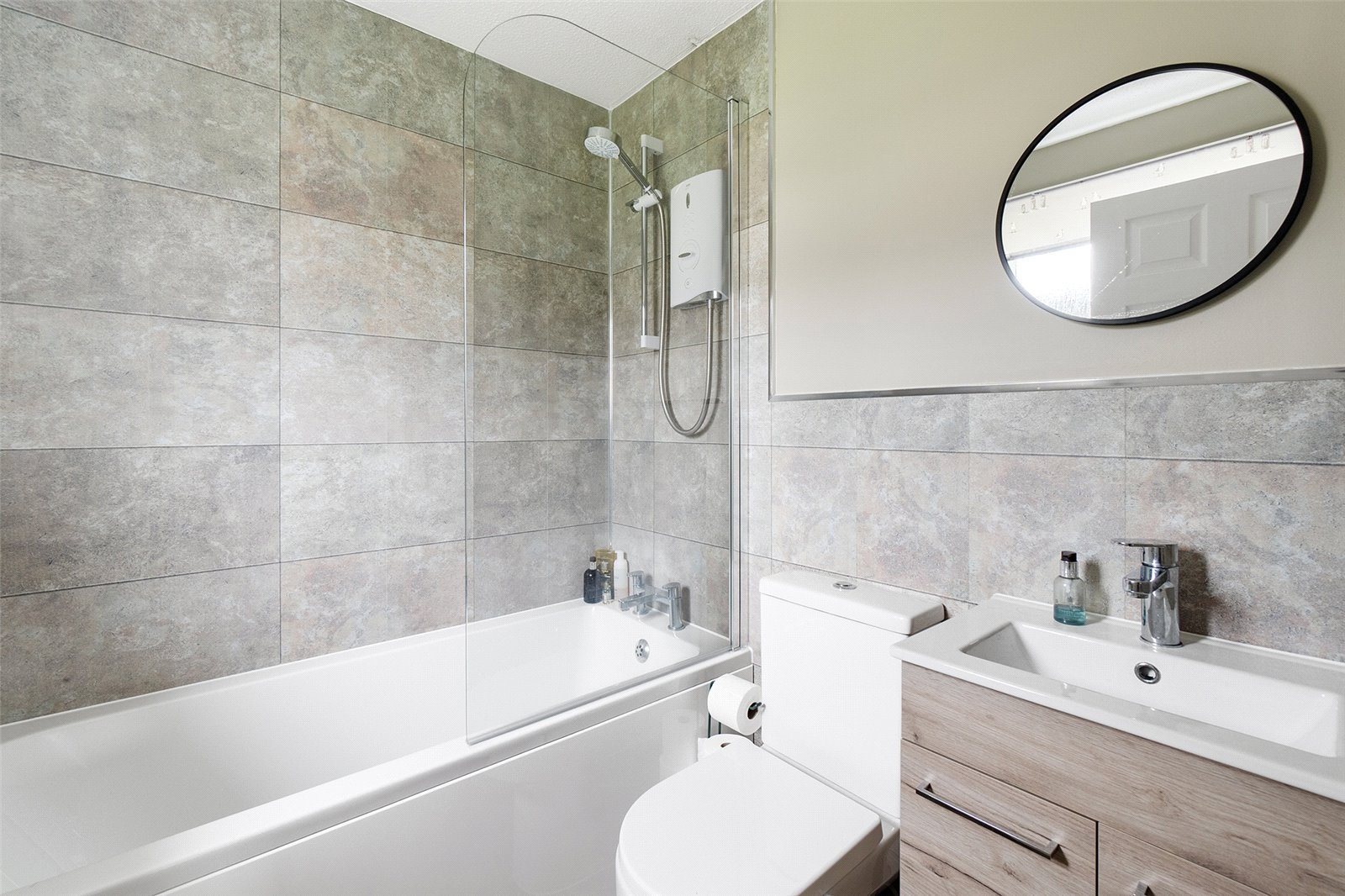 Bathroom Fitted with a modern three-piece suite comprising panelled bath with electric shower and screen over, close coupled W.C and inset wash hand basin with vanity unit under. Tiled splashbacks, electric heated towel rail, extractor and opaque double glazed window to the side aspect.