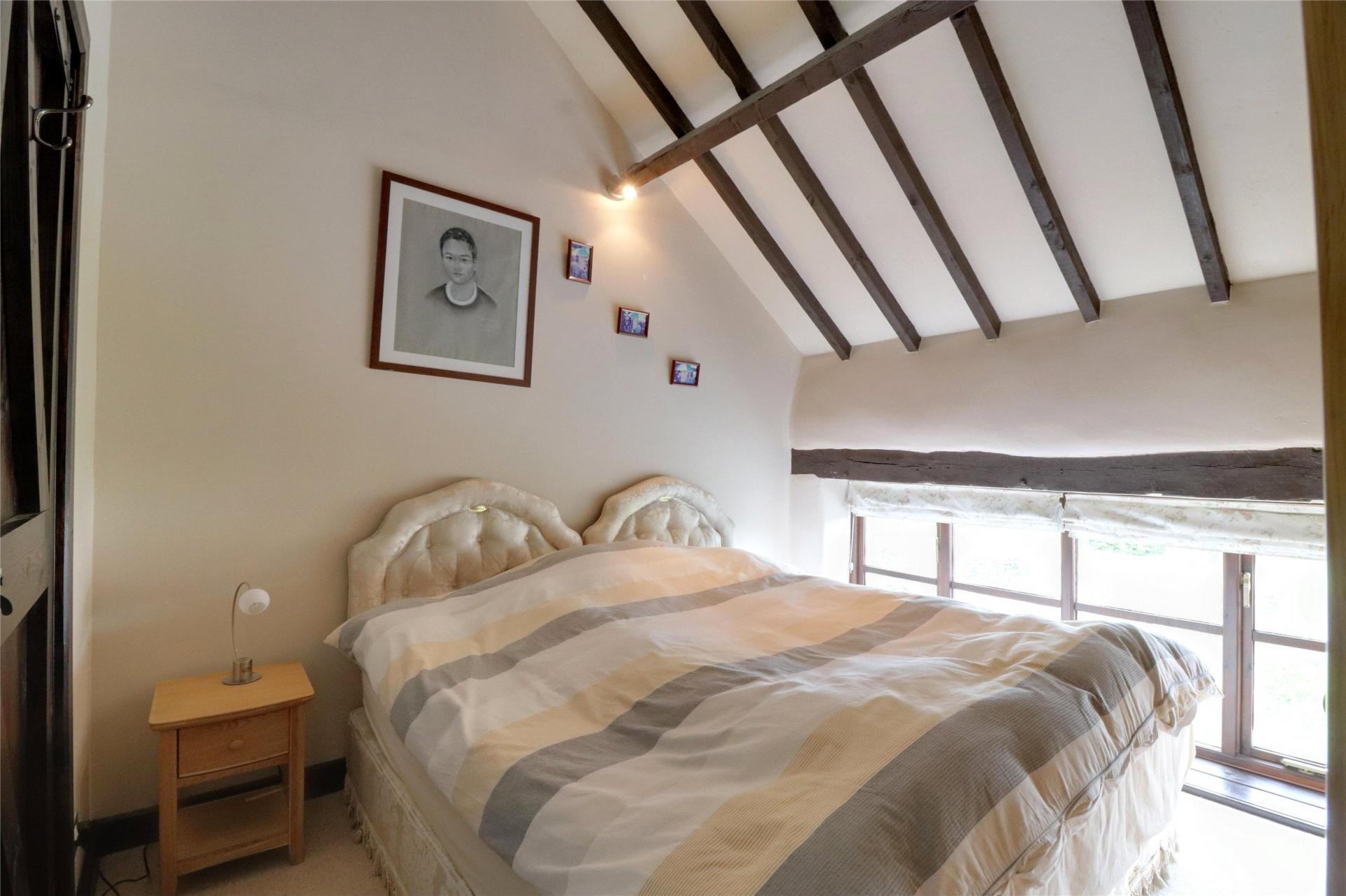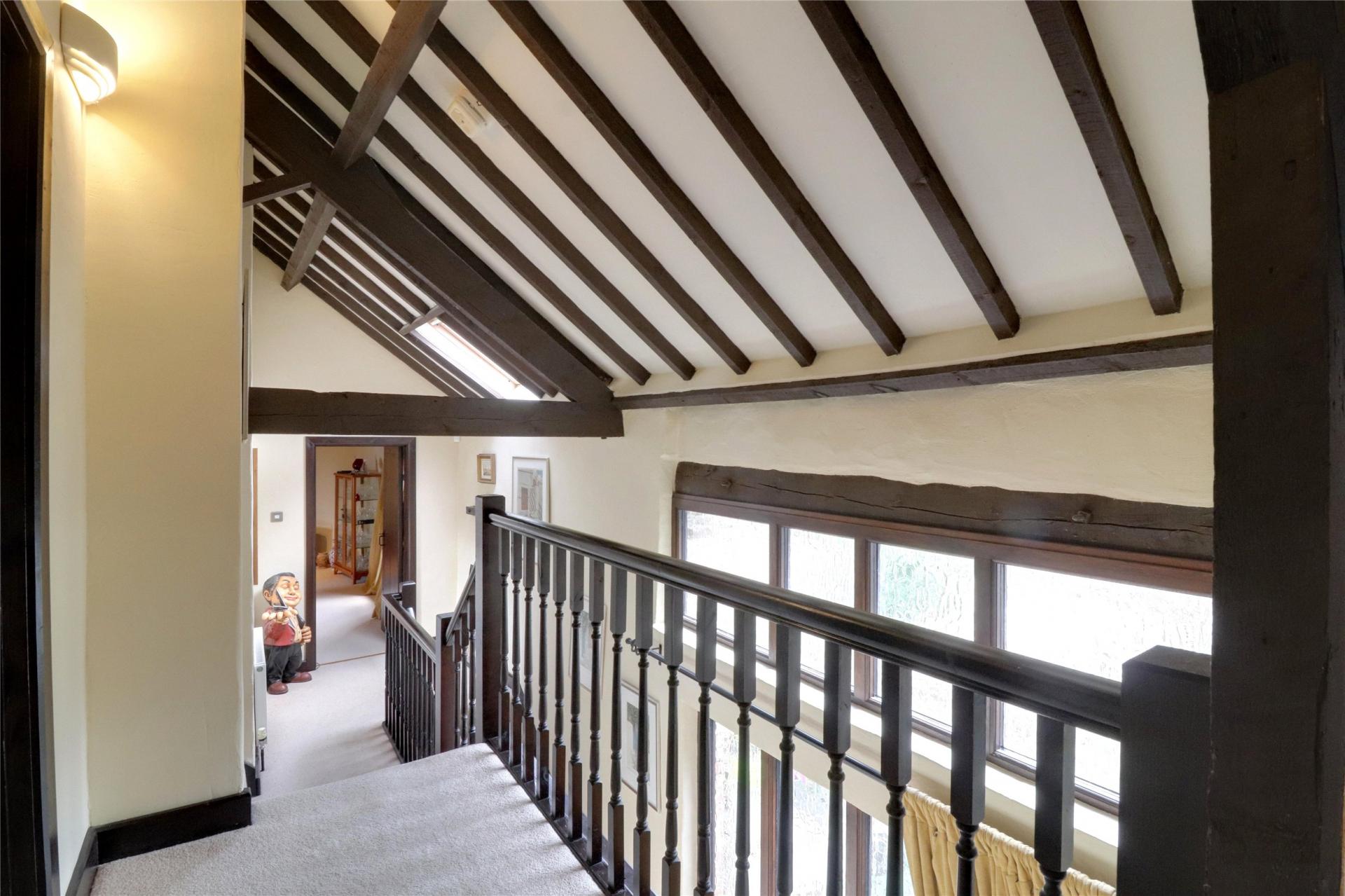 From here, double access leads you into the formal dining room, which is a generous space enhanced by a large storage cupboard and the first glimpse of the stunning vaulted ceilings and original exposed beams that run throughout the upper floor.