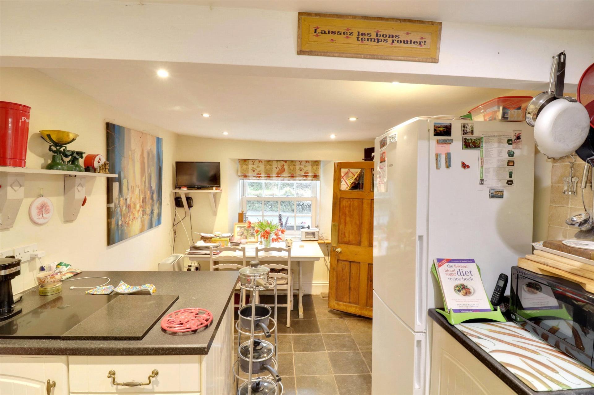 A rear lobby providing access to the outside and a useful under stairs cupboard leads through to the double aspect kitchen and breakfast room. Here, a range of kitchen units and work surfaces sit alongside an electric hob and two double ovens, while opposite stands a wood fired twin plate twin oven Rayburn, creating a warm and cosy atmosphere.