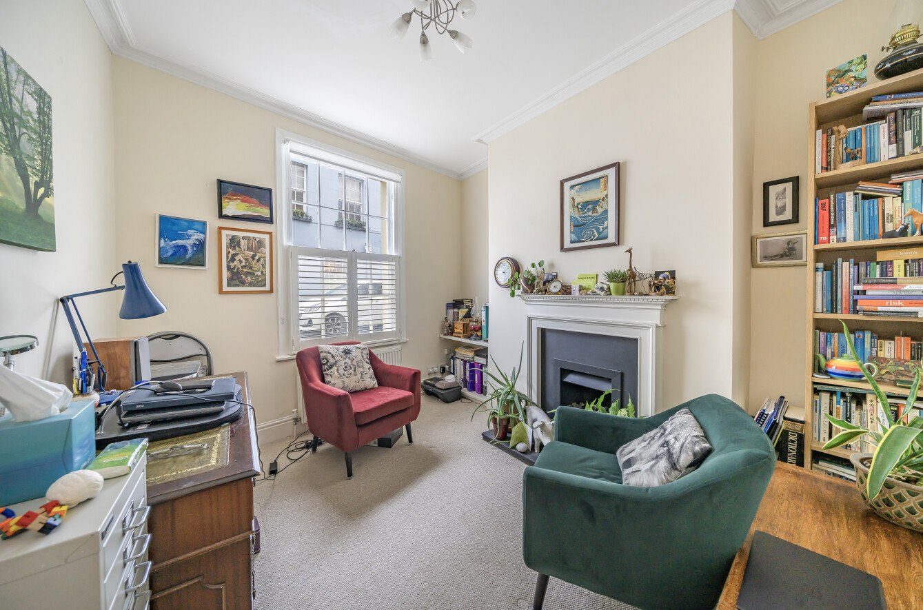 The two upper floors provide an abundance of natural light with a further three bedrooms and a modern family bathroom. The homely kitchen and dining room are found downstairs and provide access to the rear courtyard garden which is south east facing with space for outside furniture and potted plants and with a rear pedestrian gate. The house offers a versatile layout with at least two rooms to each floor, offering potential for multiple uses across living areas, bedrooms and office space; for those working from home.