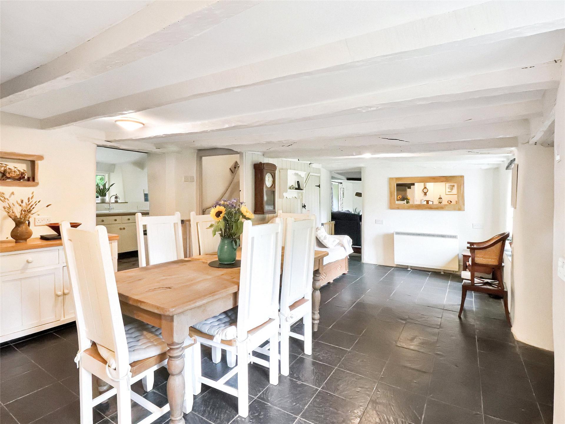 This charming thatched cottage, which, we are advised, is constructed from stone and cob, radiates warmth and homeliness. Behind the front door is an entrance vestibule, perfect for coats and boots, which opens into a spacious beamed breakfast/dining room that immediately captures the character of the home. One end of the room features an inglenook with an oil Rayburn and a former bread oven. Under stairs storage is found on the approach to a double aspect, beamed lounge, measuring approximately 23 foot in length, complete with a log burner in another inglenook fireplace.