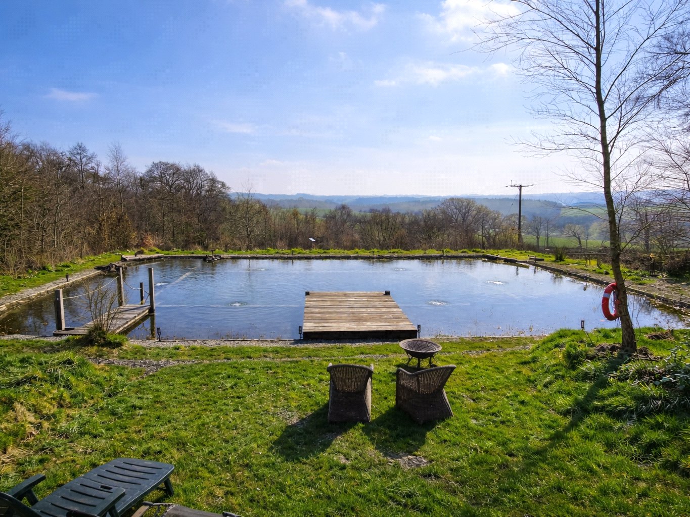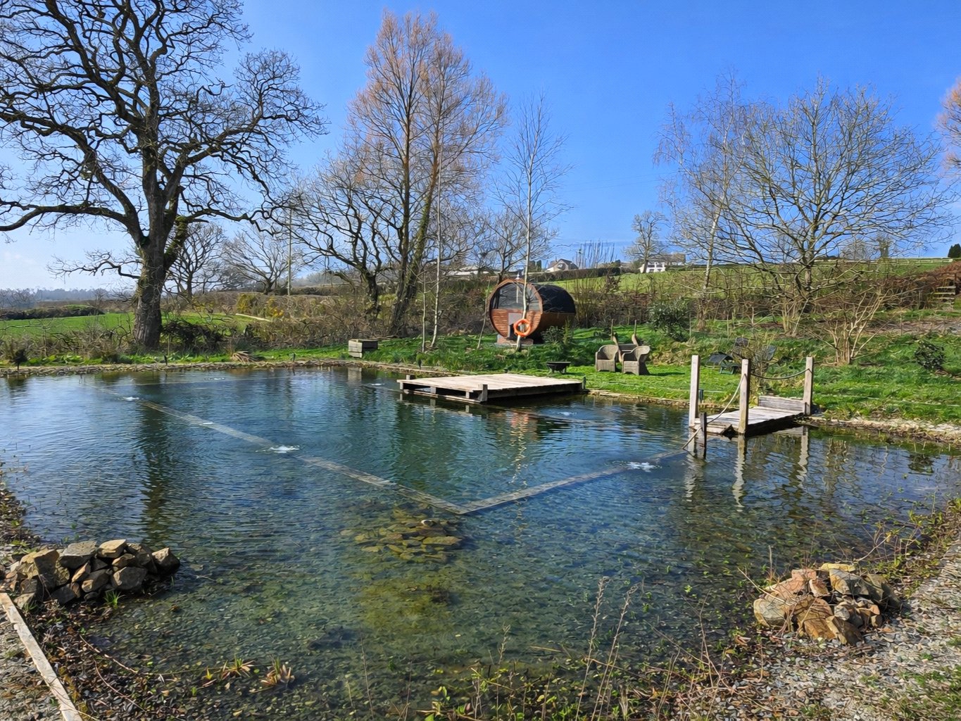 A 45 metre boardwalk illuminated with fairy lights winds through woodland to the natural swimming pool, which enjoys breathtaking views across the Devon countryside to Dartmoor. The pool is rainwater fed, important due to its low nutrient content, and the pool water is continually filtered through planted gravel beds to ensure crystal clear water.