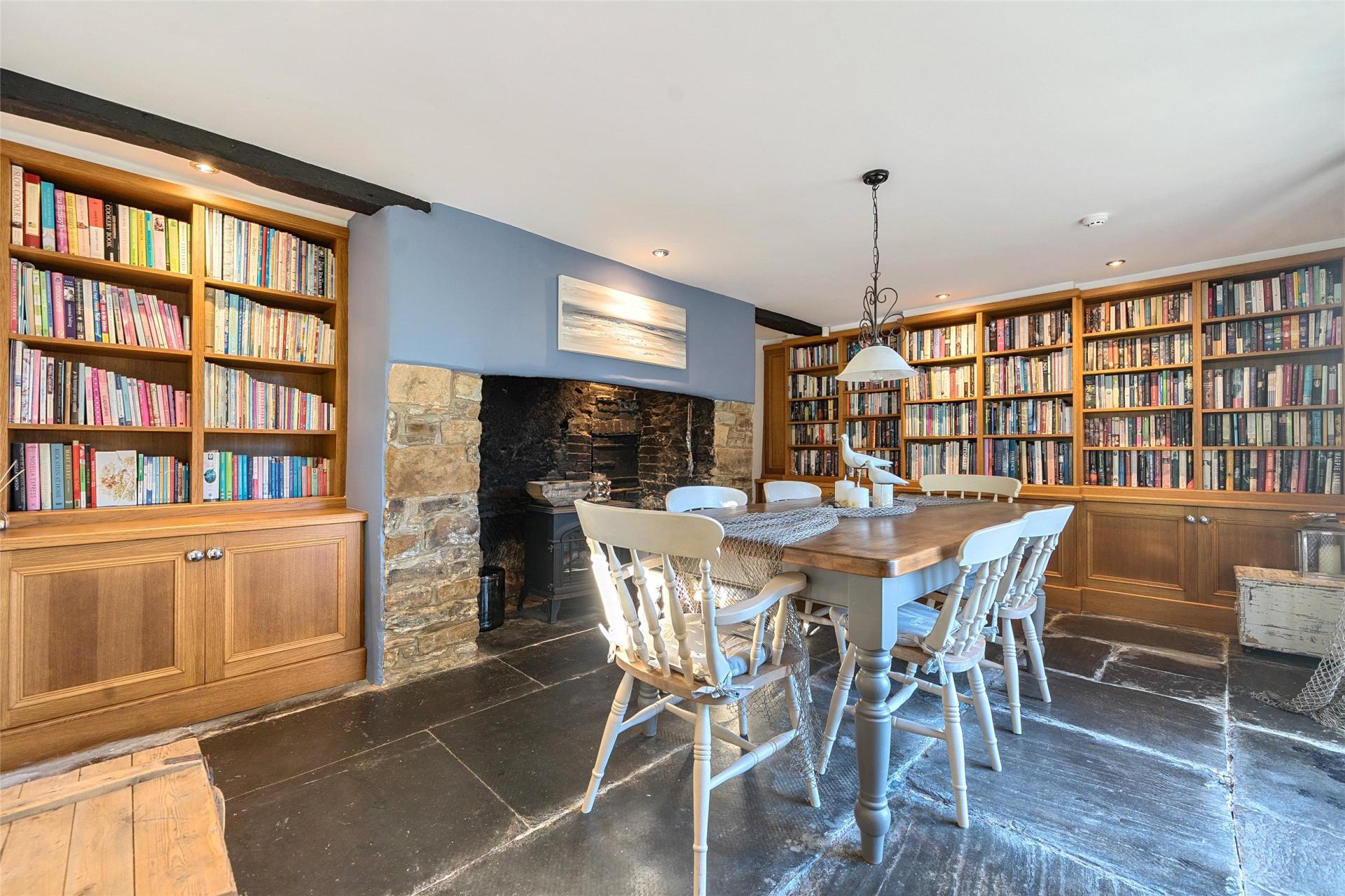 The sitting room flows into the dual aspect library, which houses two large bookcases, fitted cupboards, and a traditional stone fireplace with a clome oven. French doors open directly to the garden, bringing in natural light and providing easy access to the outdoors.