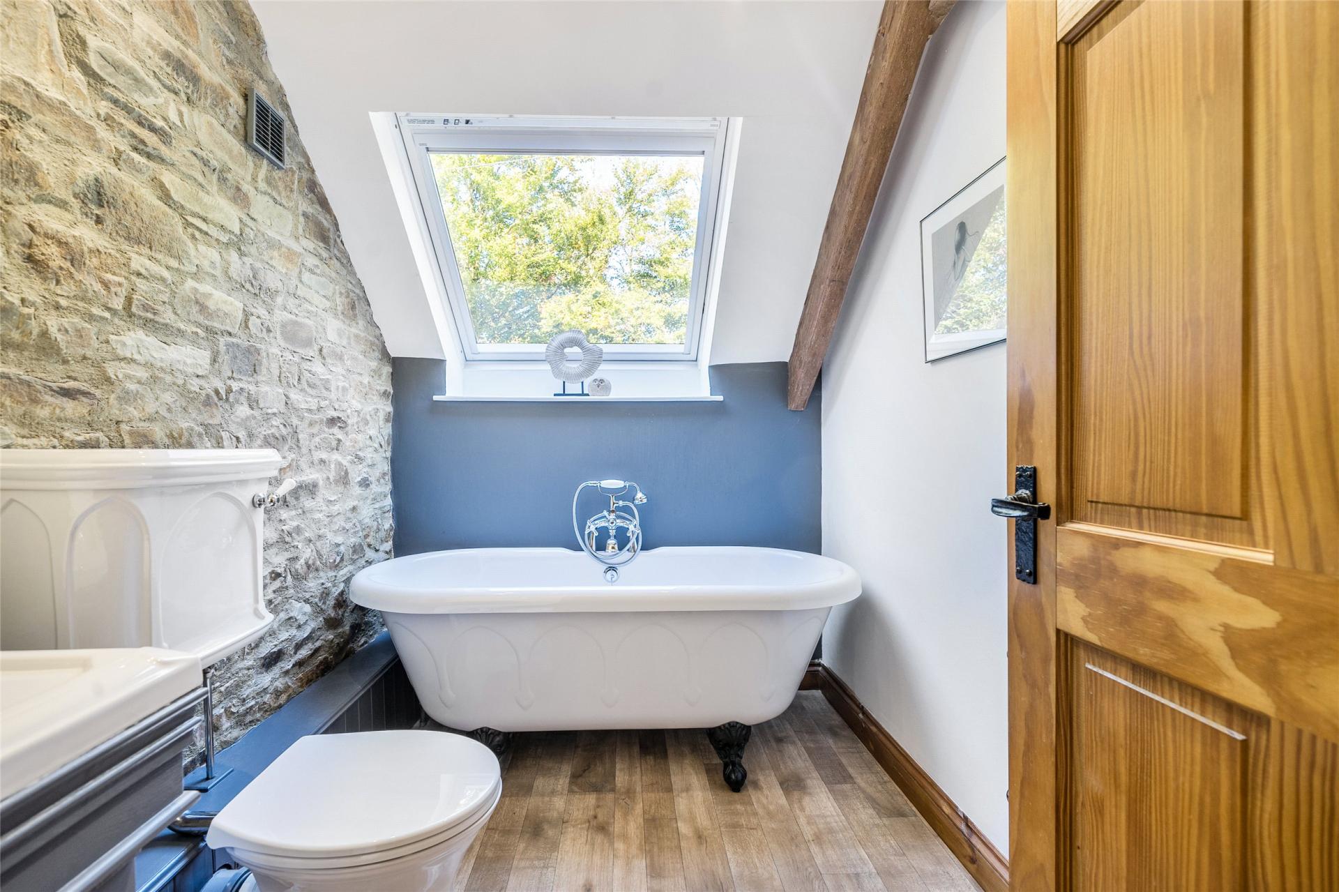 The formal dining room adds further charm, with wooden flooring, a dado rail and a feature fireplace that includes a substantial wooden lintel and a carved stone dated 1683. Planning consent is already in place to reconfigure this room into a new kitchen, which would transform it into a light and spacious central hub.