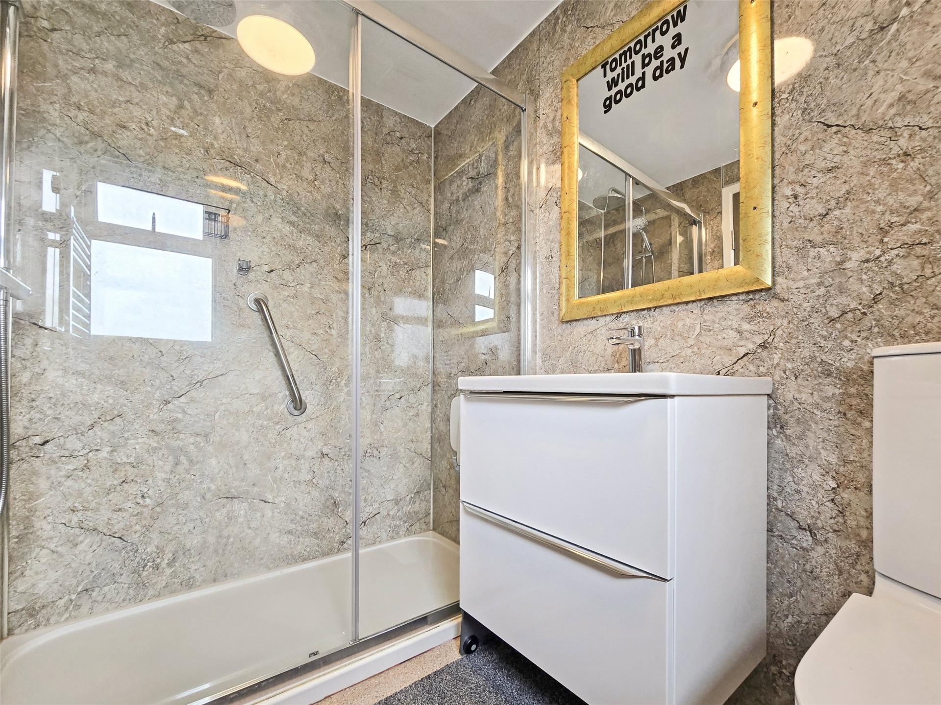 - Contemporary shower room with large enclosure and vanity storage