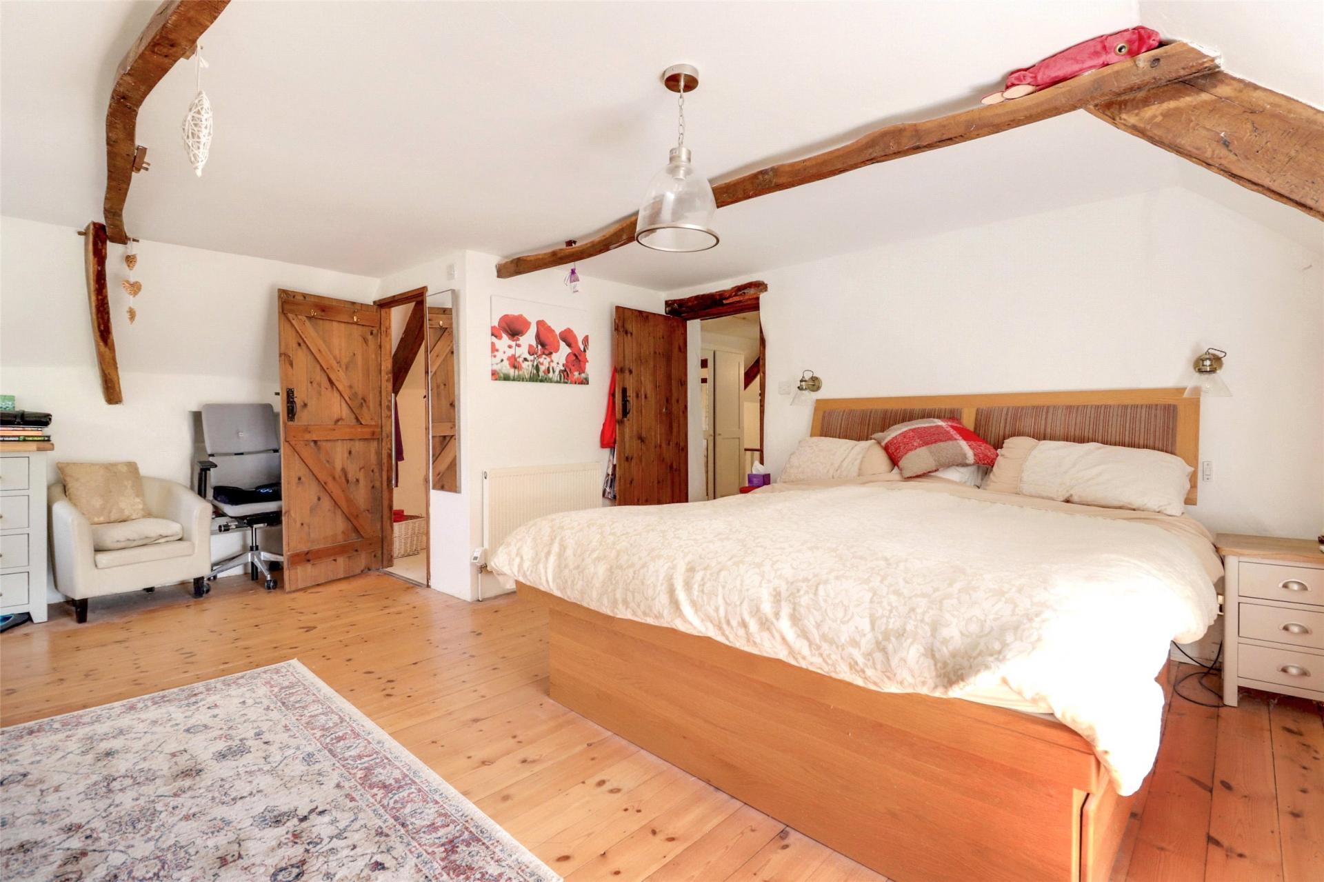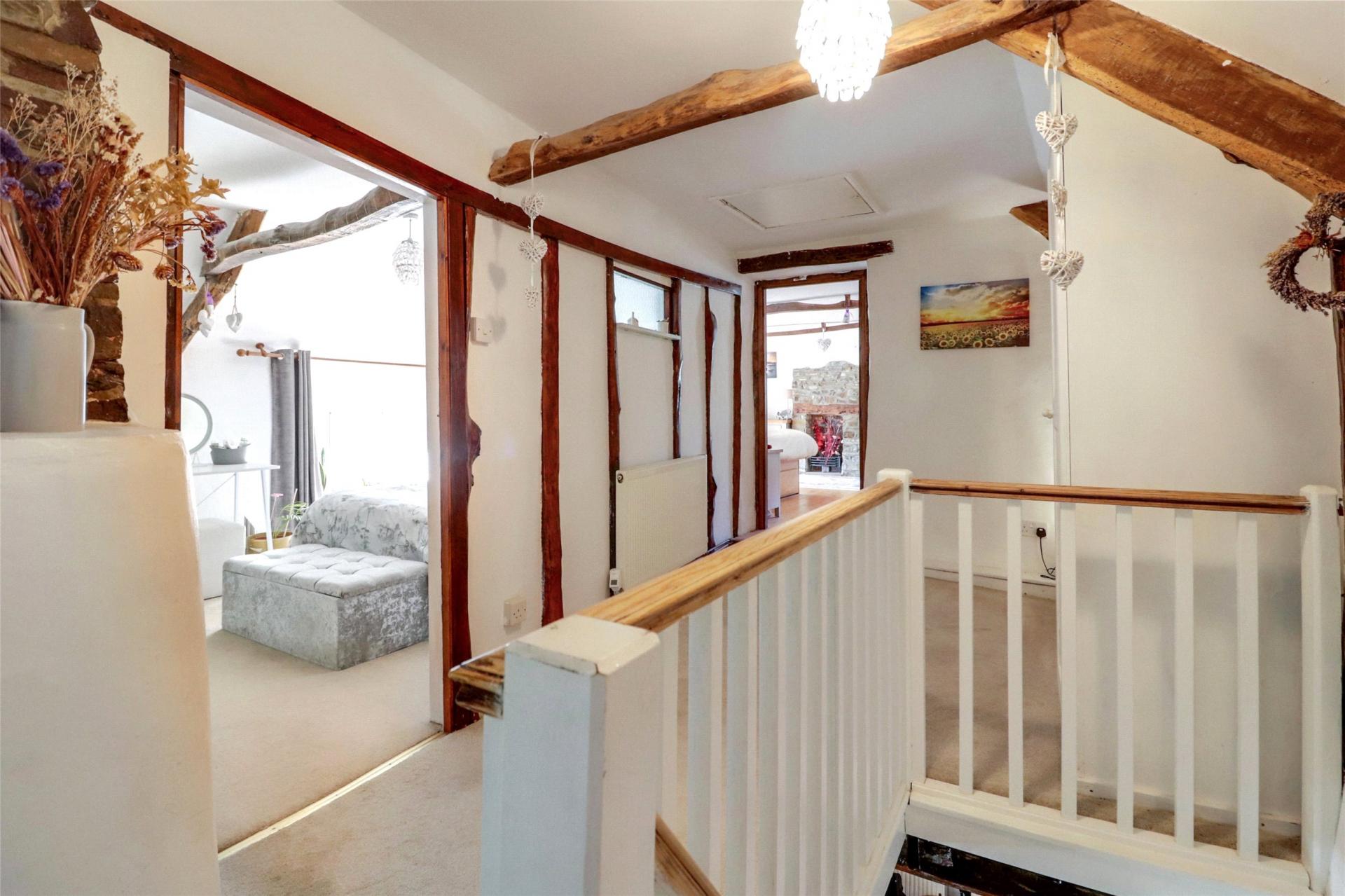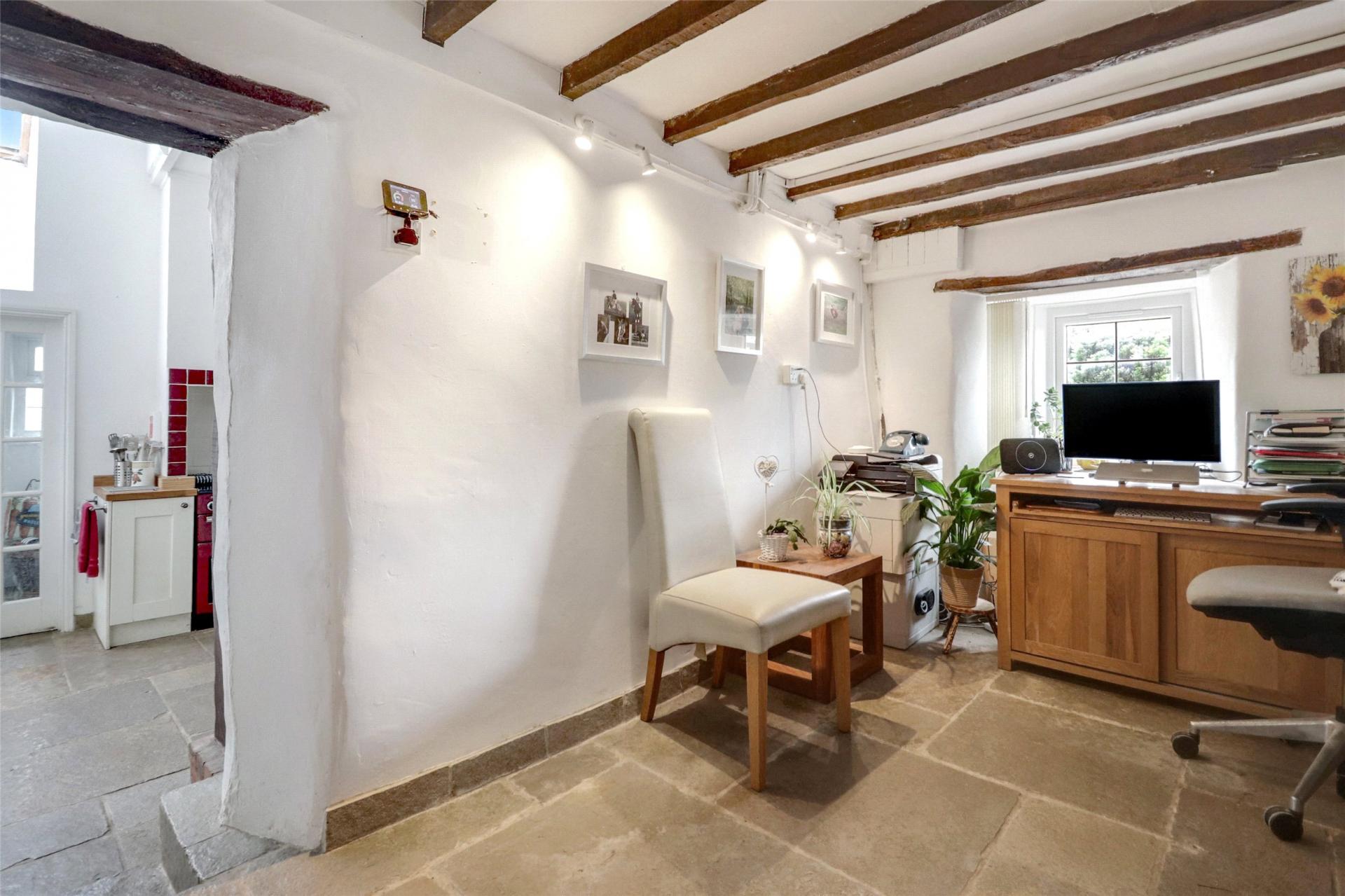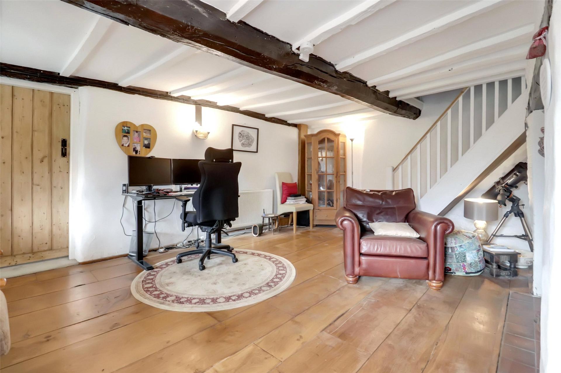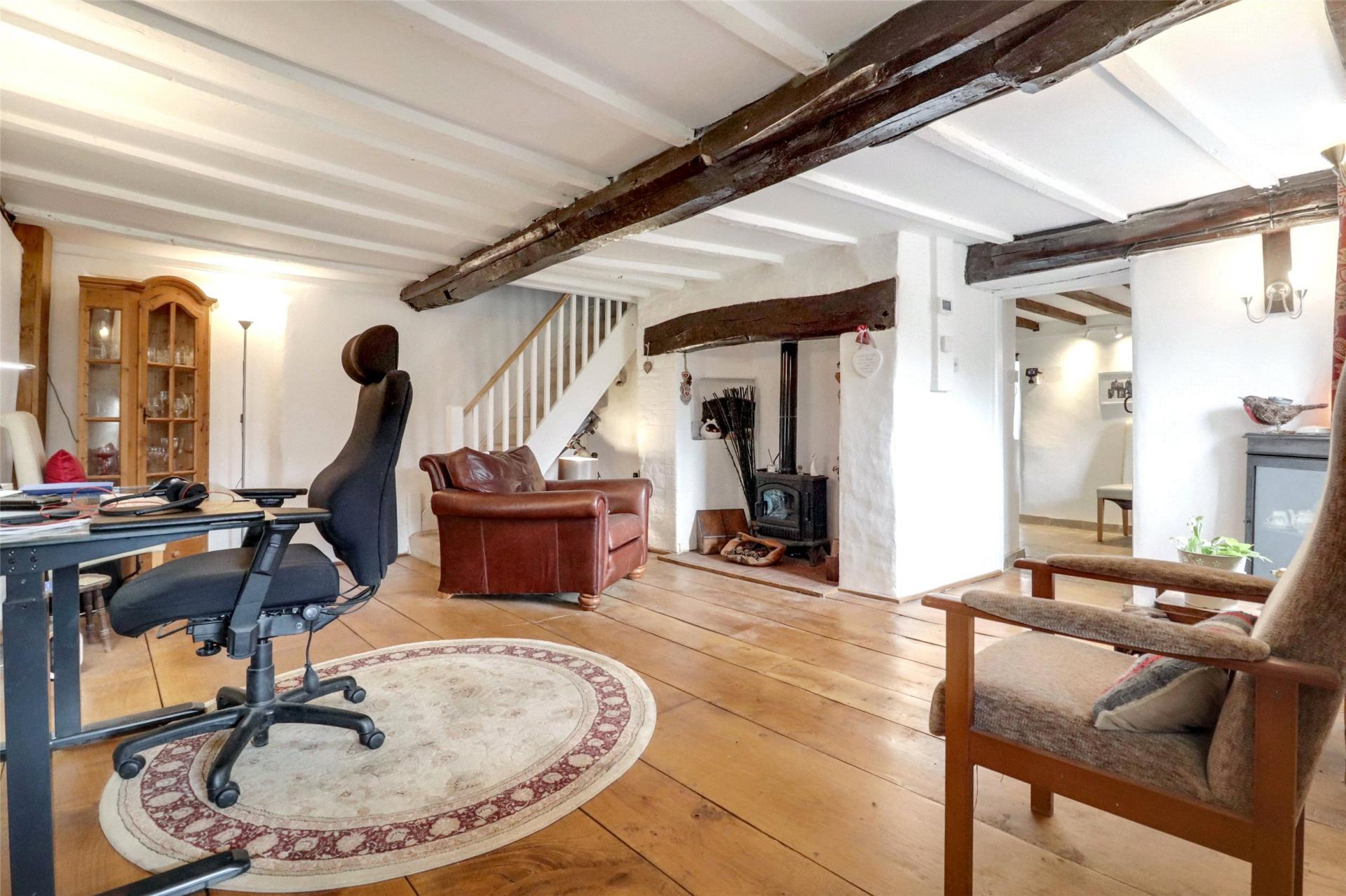 Step through a charming pergola draped in trailing wisteria to an impressive oak-framed entrance, where the storm porch opens into a welcoming reception hall, currently arranged as a home office. Rich oak plank flooring, exposed beams and a staircase rising to the first floor create an immediate sense of character and warmth.