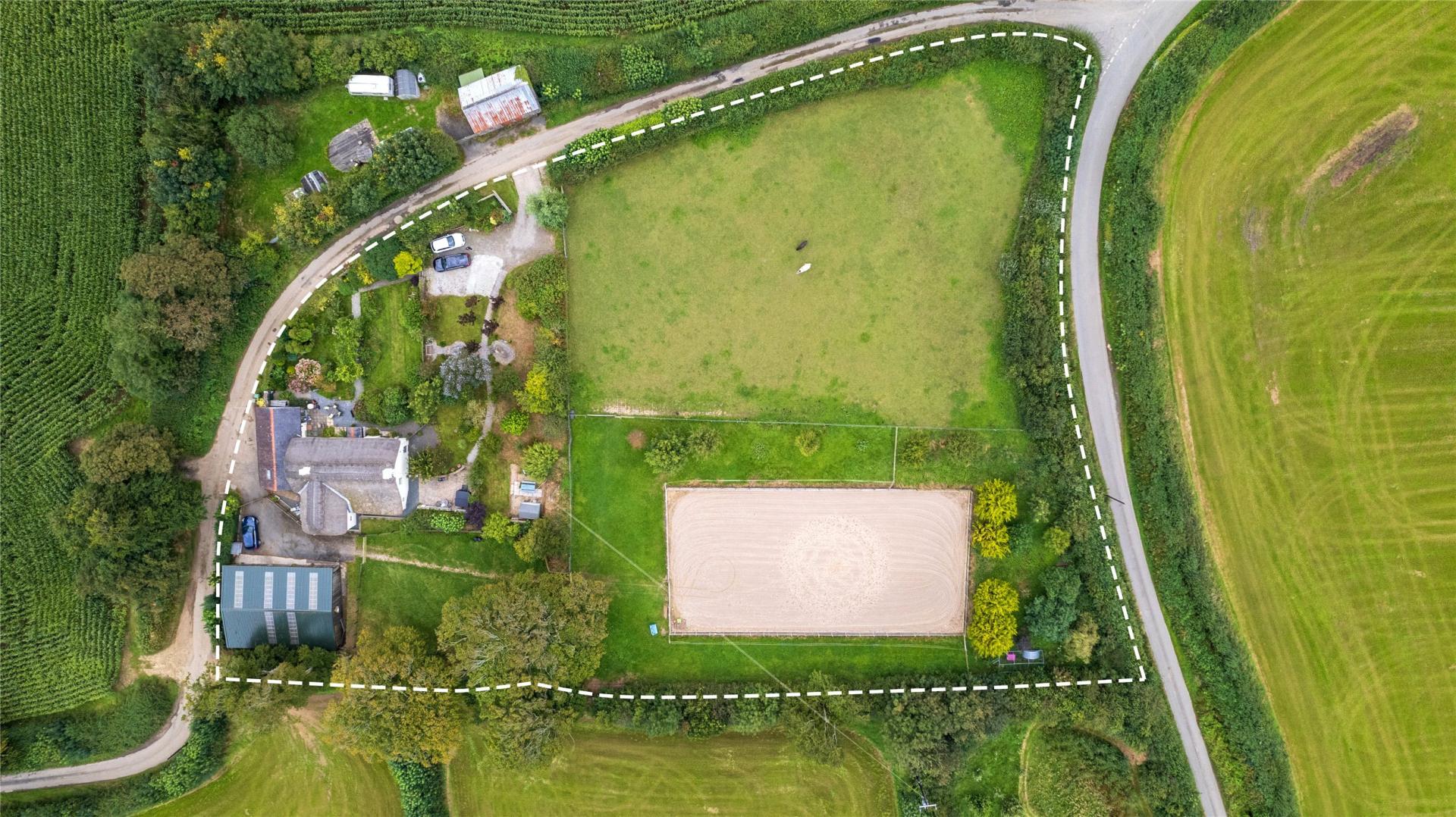 Set within approximately two acres, the property also offers excellent equestrian facilities accessed via a separate entrance behind the house. These include a stable block with hardwood interior, comprising two loose boxes, a foaling box and tack room, together with a workshop/store 21'0" x 13'7" and garage "17'10" x 13'8". Beyond, a five-bar gate leads to a turnout paddock, which in turn opens to a 40m x 20m ménage and adjoining paddock land. The field is enclosed by fenced and hedged boundaries, with no known public footpaths crossing the land.