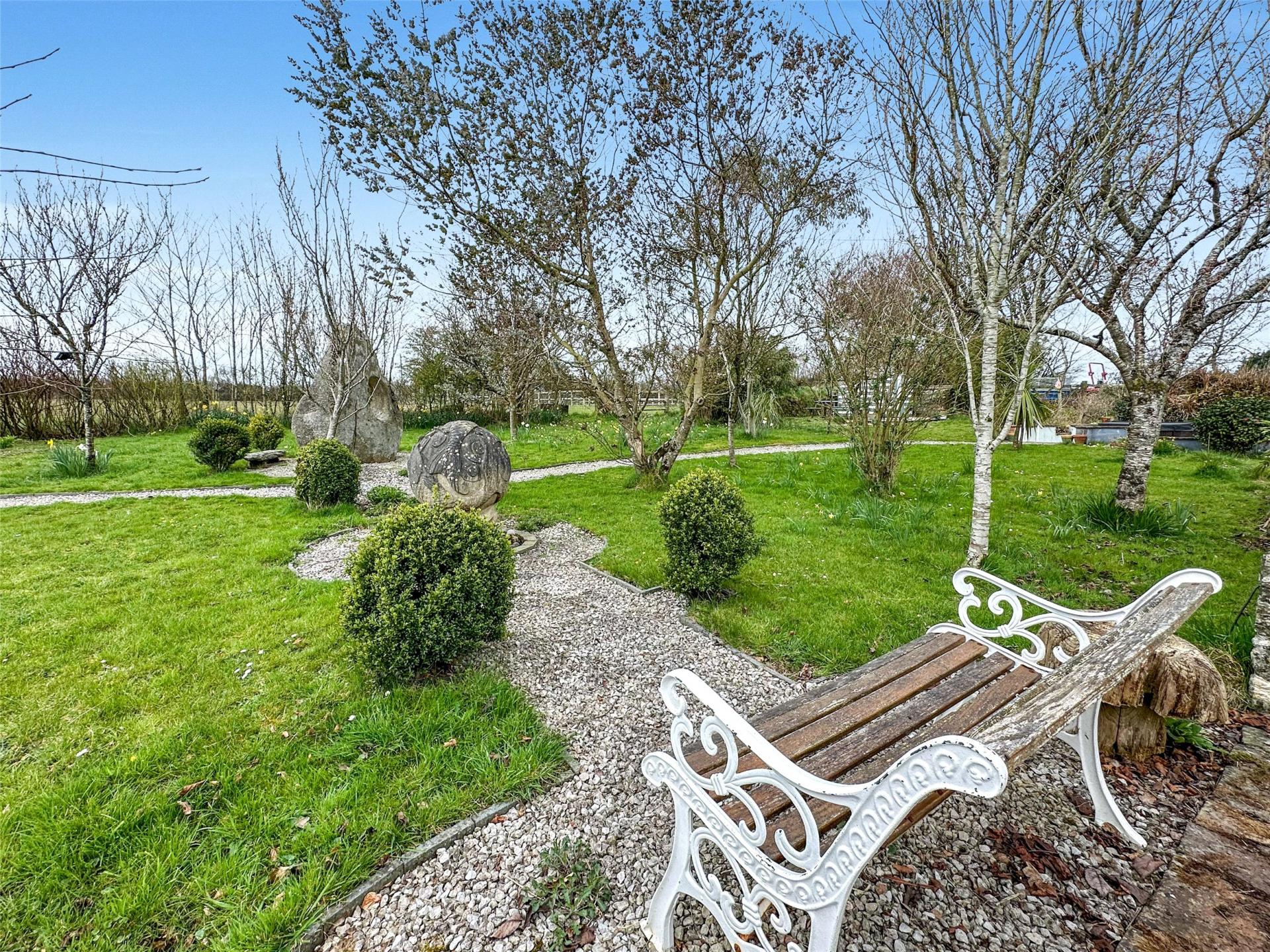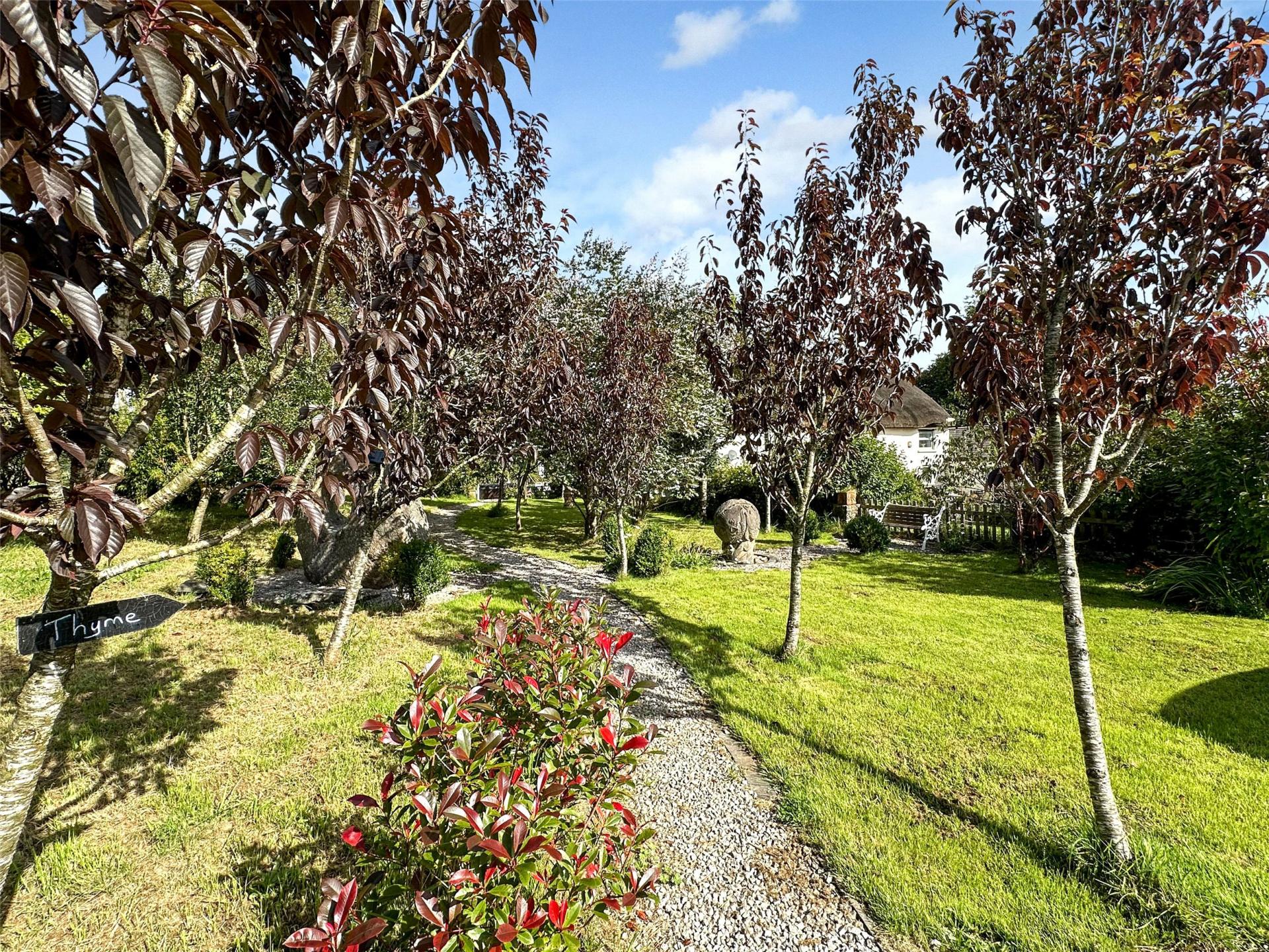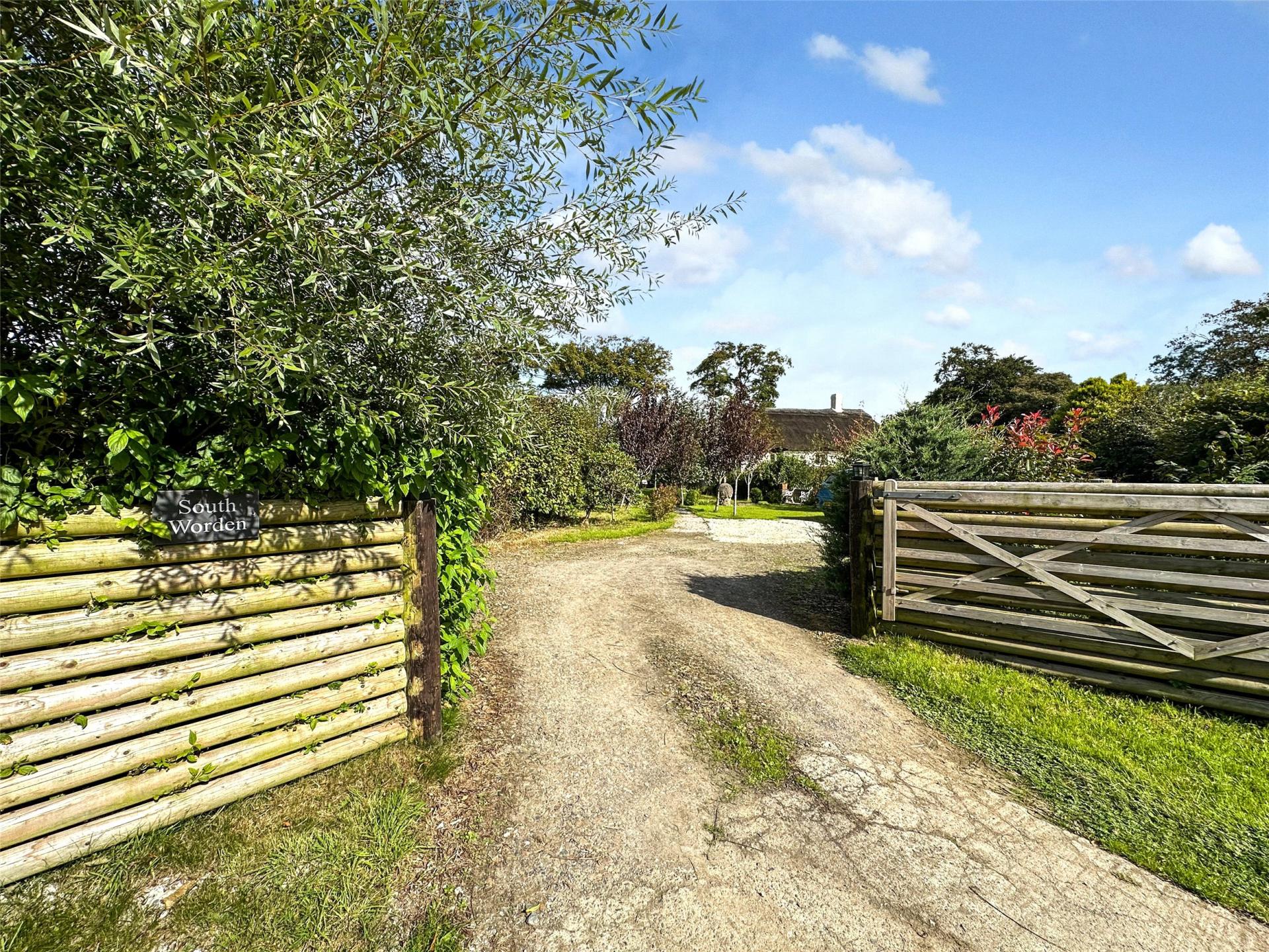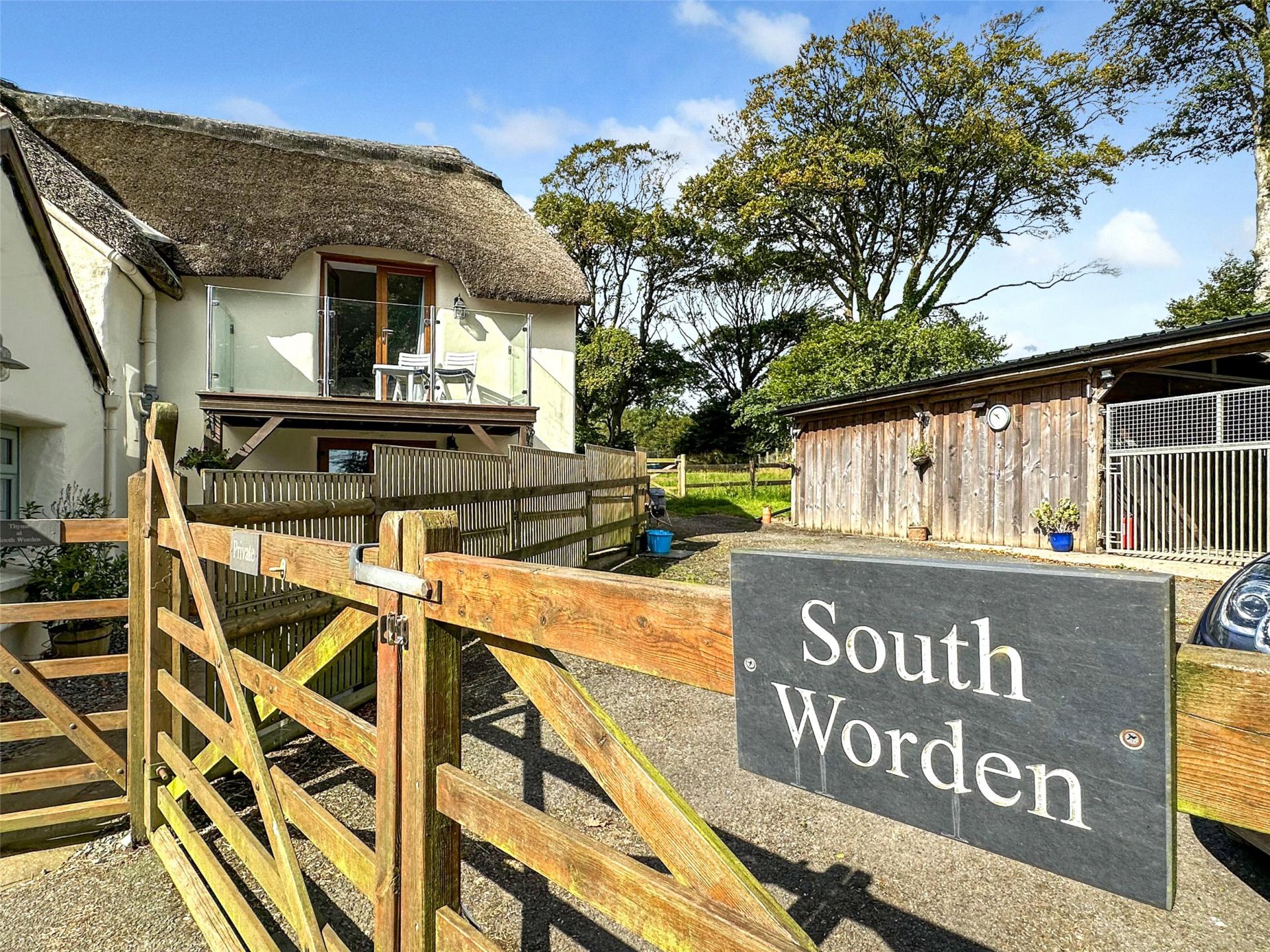 South Worden is approached via a five-bar gate from a quiet lane, opening to a generous parking area with space for several vehicles. Gravel pathways lead through a charming fruit orchard, enhanced by bespoke stone sculptures, to the holiday let, while a separate gate opens into the owners' private enclosed garden. Both areas enjoy attractive patios and alfresco seating, with the cottage area also benefiting from a hot tub.