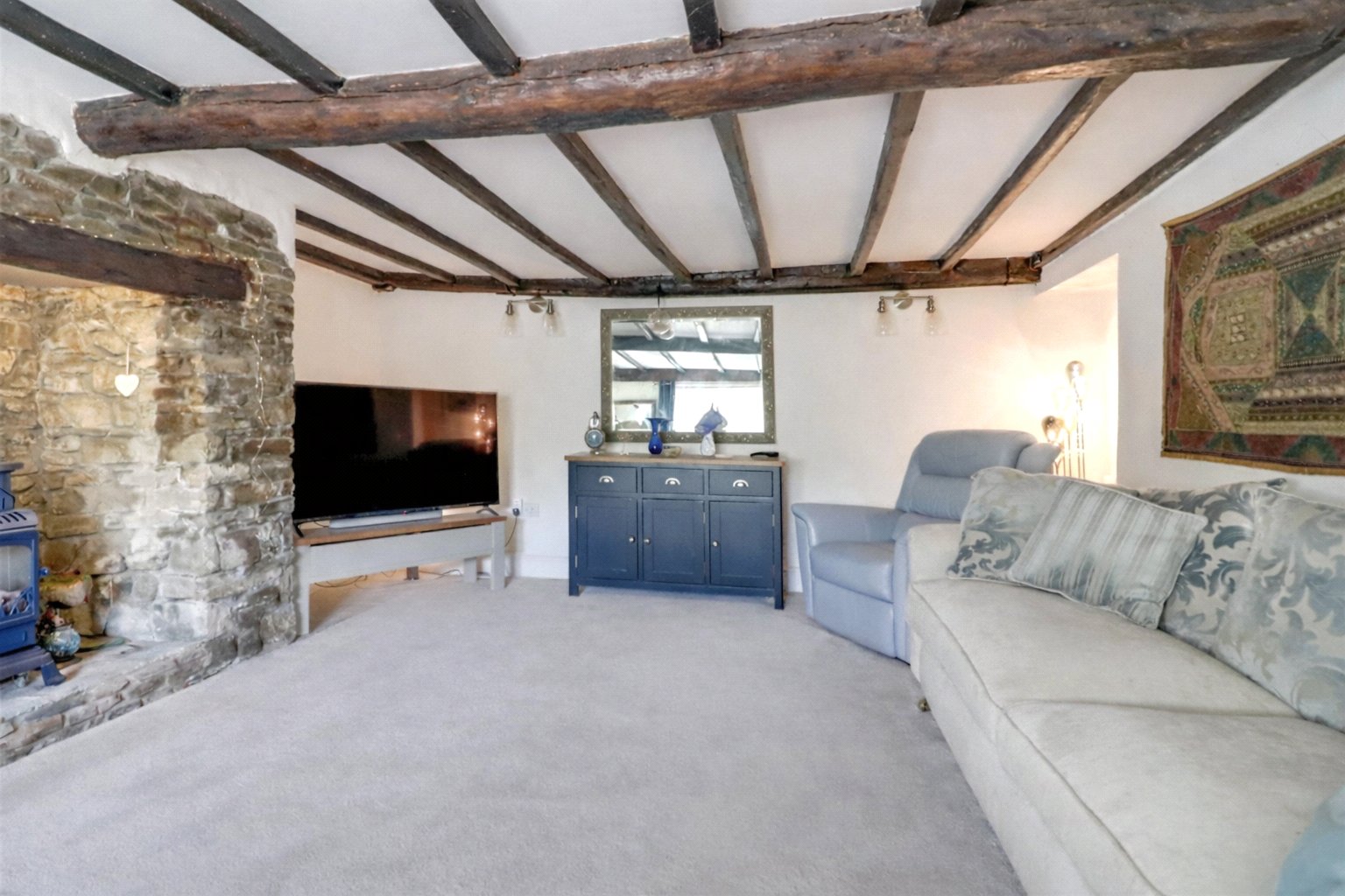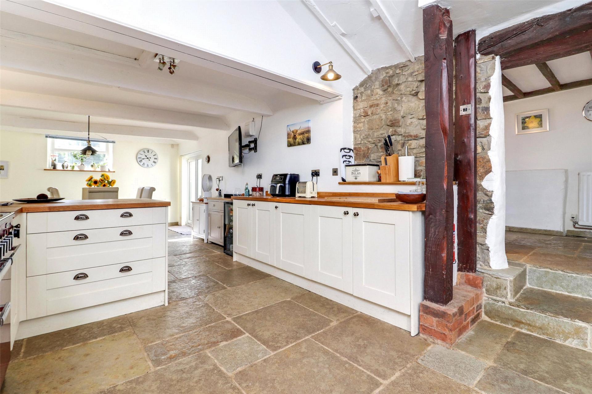 Extending to over 31 feet, this exceptional space is beautifully semi-vaulted with exposed beams and Velux-style windows, combining grandeur with everyday comfort. The kitchen is superbly appointed with an extensive range of fitted units, twin Belfast sink and wooden block worktops, while a breakfast bar and range cooker set within a central chimney breast create a natural focal point. A utility room and separate boiler room lie beyond, while at the far end, the dining and relaxed seating area opens to the garden through sliding doors. Solid stone flooring and underfloor heating complete this outstanding heart of the home.