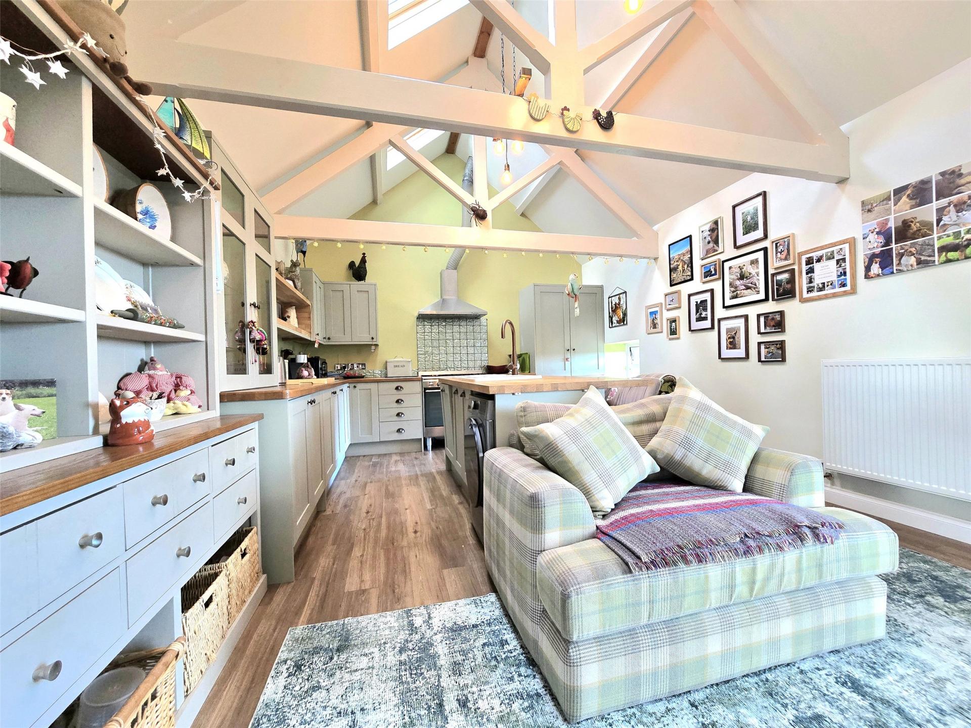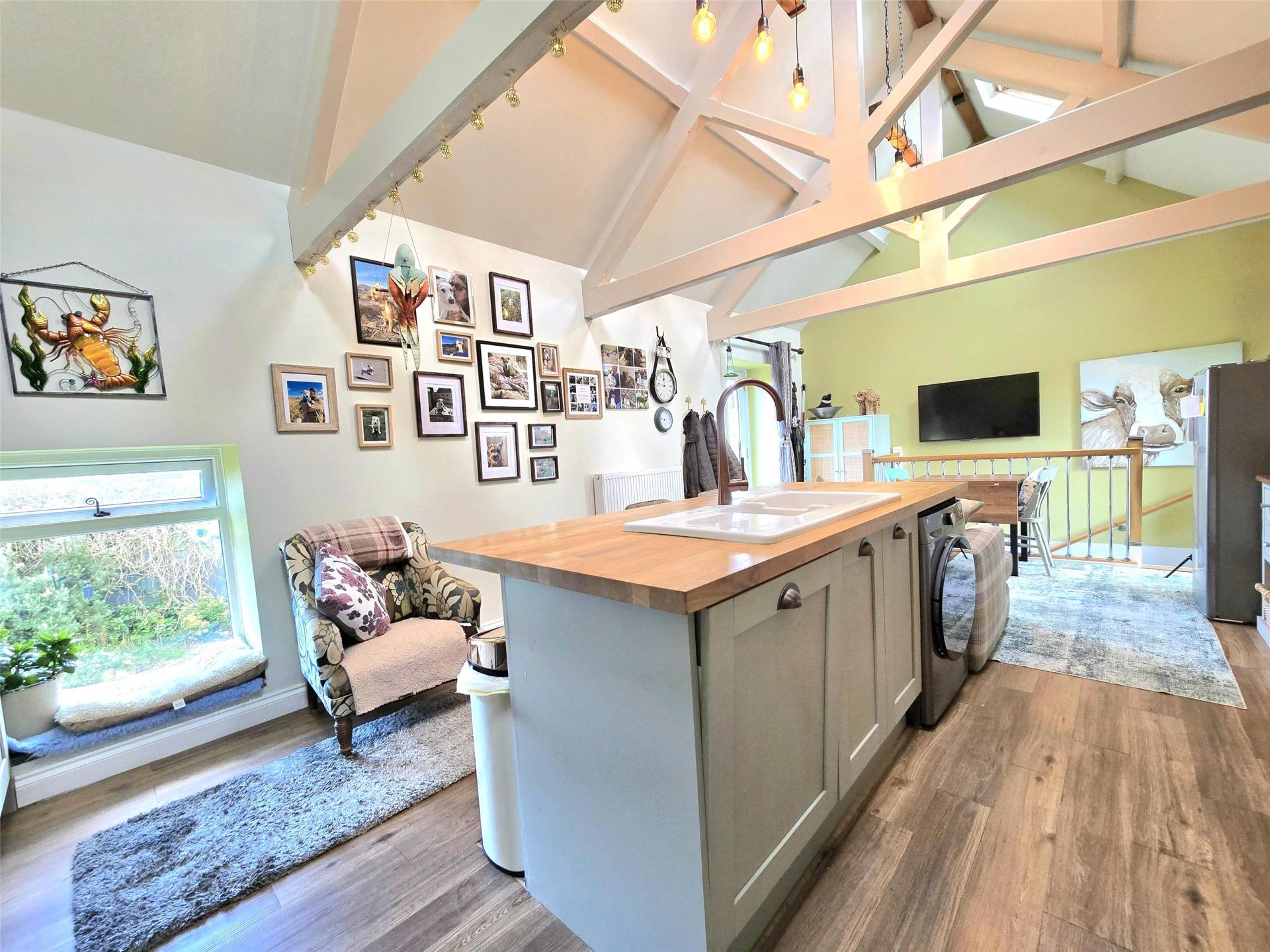 - Striking two-bedroom barn conversion with vaulted ceilings and exposed A-frame beams