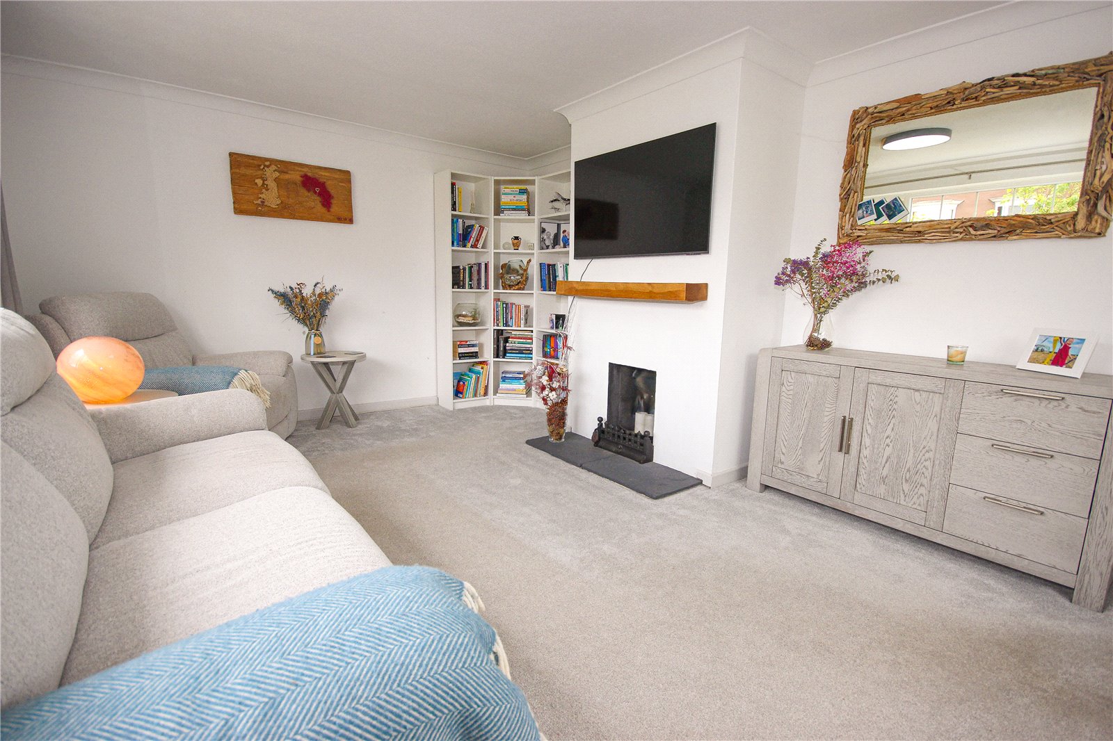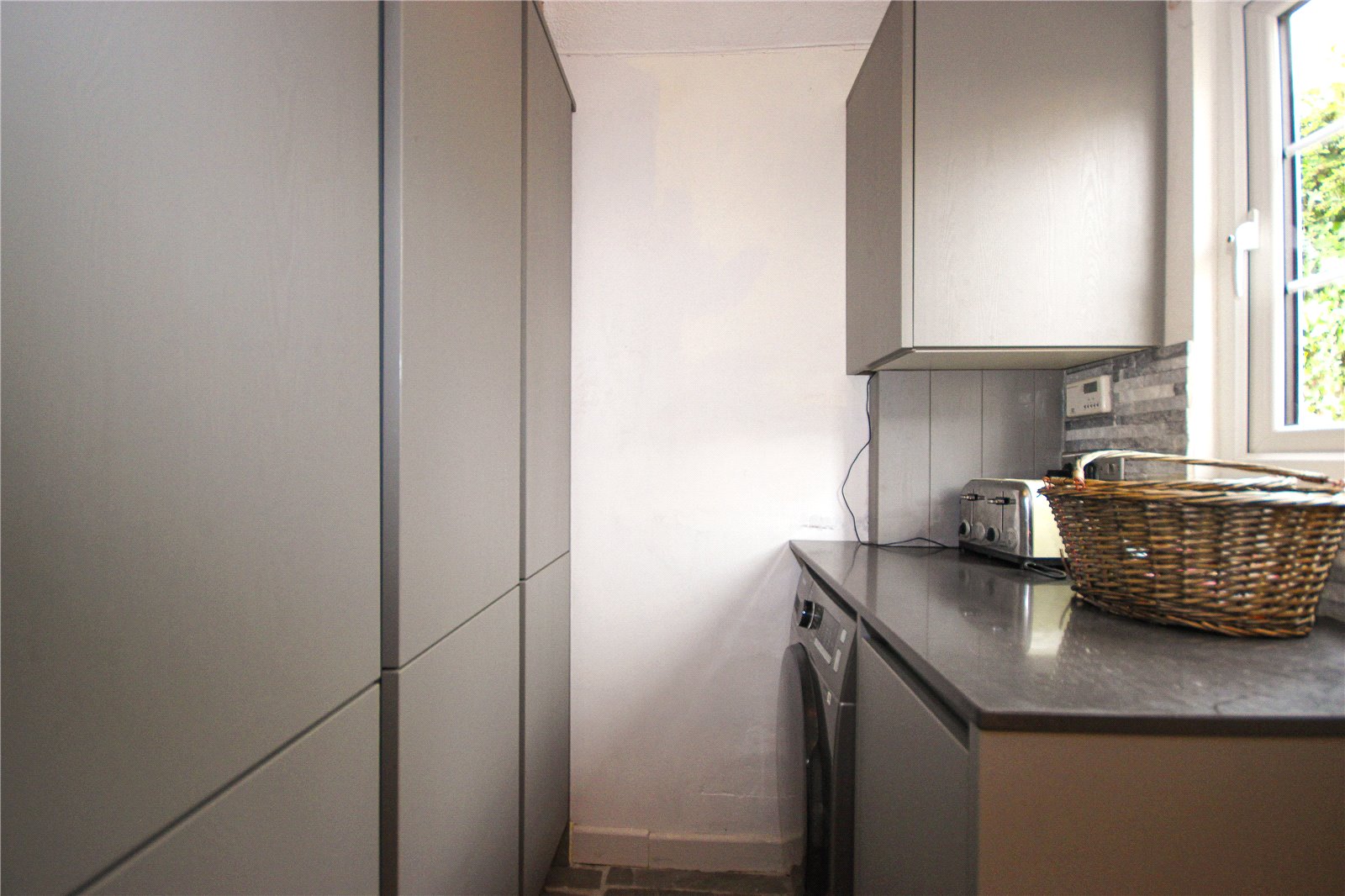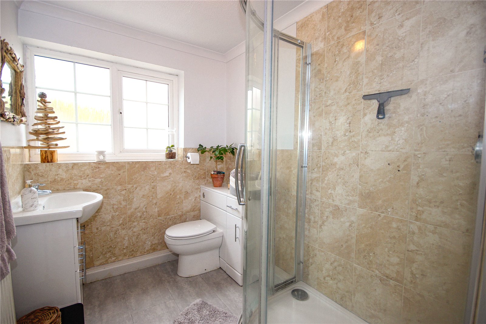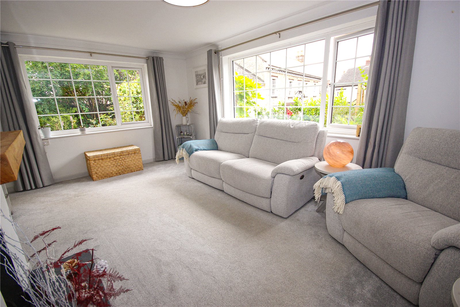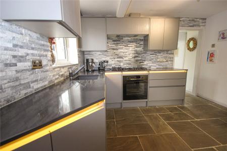 Front sliding patio doors open to a porch with an inner door which opens to the entrance hall. A door to the left opens to the good-sized double aspect living room with two large windows overlooking the front gardens and a feature open fireplace. Flagstone style flooring flows through the hallway into the open plan kitchen/dining room at the rear of the property. The kitchen has been comprehensively fitted with a bespoke light grey coloured 'Wren' premium kitchen. This kitchen was installed less than two years ago as part of the Infinity Plus range. Attention has been given to every detail, from the positioning of all appliances, even down to the placement of the shelving. The matching base and wall units has attractive integrated under counter lighting and soft closing cupboards and drawers. There are quartz worktops with complimentary tiling surrounding, an undermounted sink, built-in Bosch electric oven, with Neff five burner gas hob and extractor above and an integrated dishwasher. There is ample space for table and chairs, and a door arch opens to the utility, with matching 'Wren' base and wall units to the kitchen and includes an integrated full-size fridge freezer, double larder storage unit, a dual washer/dryer, bin/recycling units and a cupboard housing the Worcester gas-fired central heating boiler.