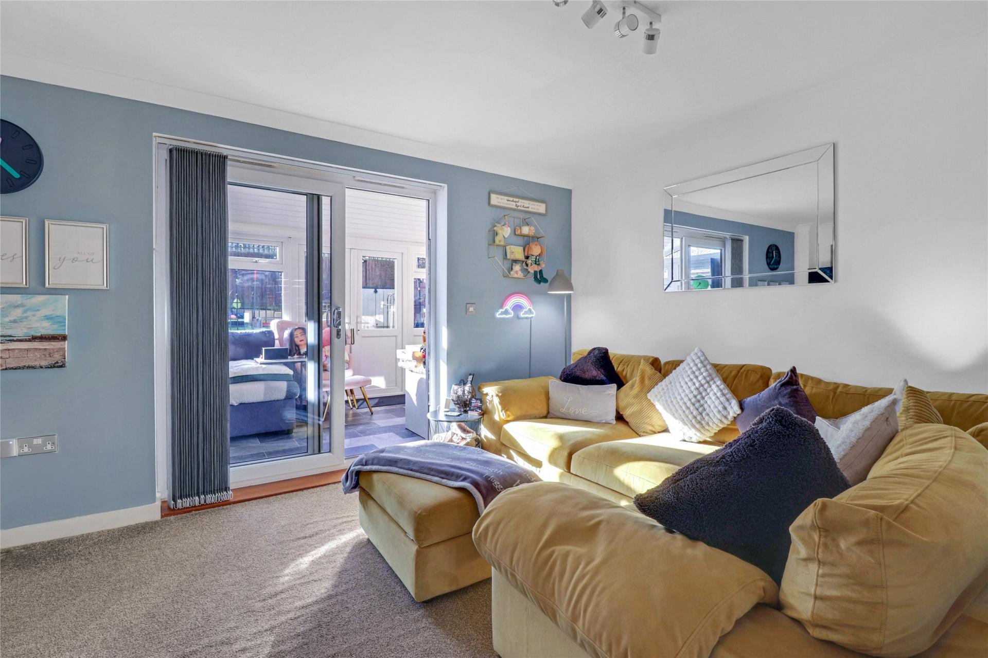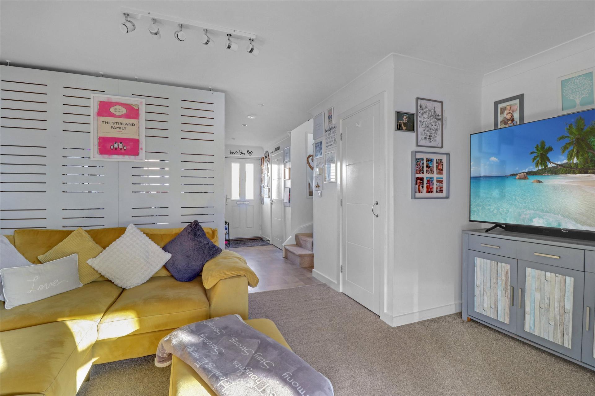 The living area provides a cosy and inviting space to relax, complete with a useful under-stairs storage cupboard.