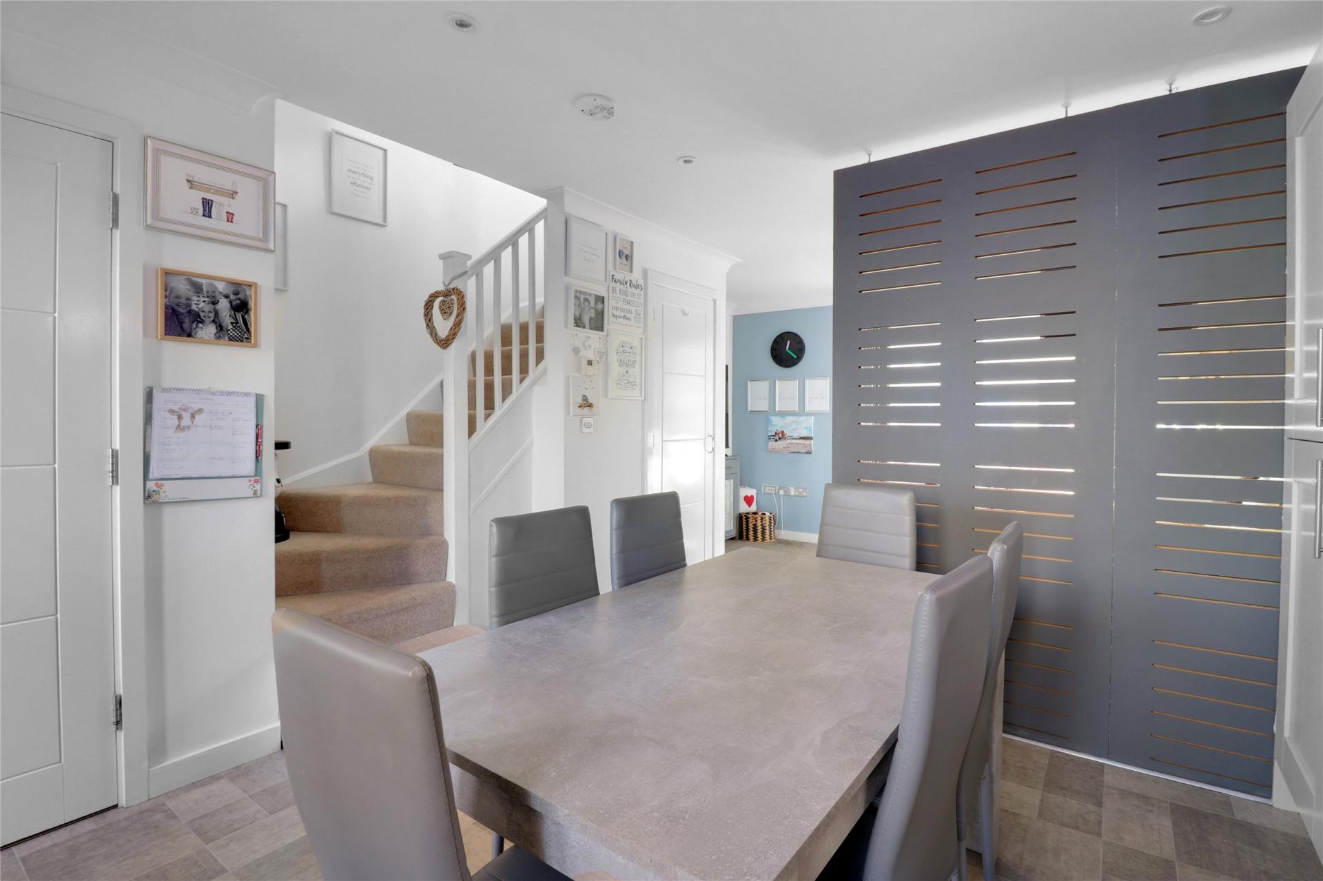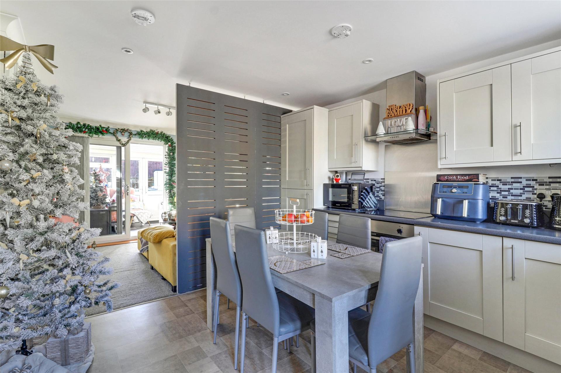 Upon entering the property, you are welcomed into the spacious open-plan living area. The modern fitted kitchen features an integrated oven and hob, integrated fridge/freezer, ample cupboard storage, and space for a washing machine, with the added benefit of offering enough room to comfortably accommodate a table and chairs.