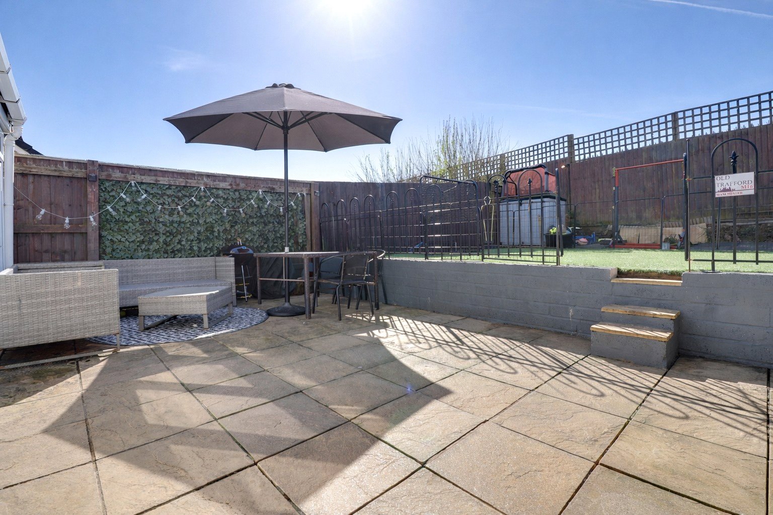 The rear garden is one of the highlights of this wonderful property. Enjoying a delightful south-facing aspect, the garden features a sizeable patio area perfect for outdoor dining or private seating, with steps rising to a low-maintenance section laid to artificial grass.