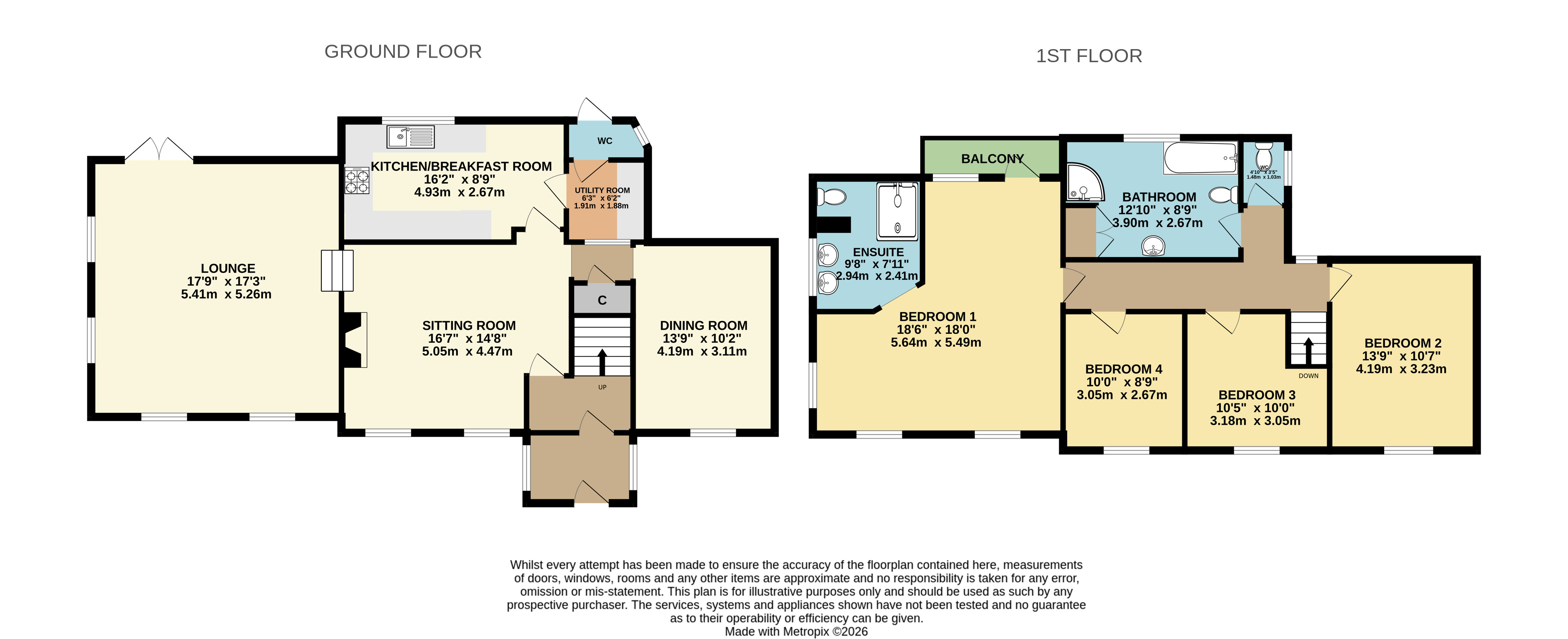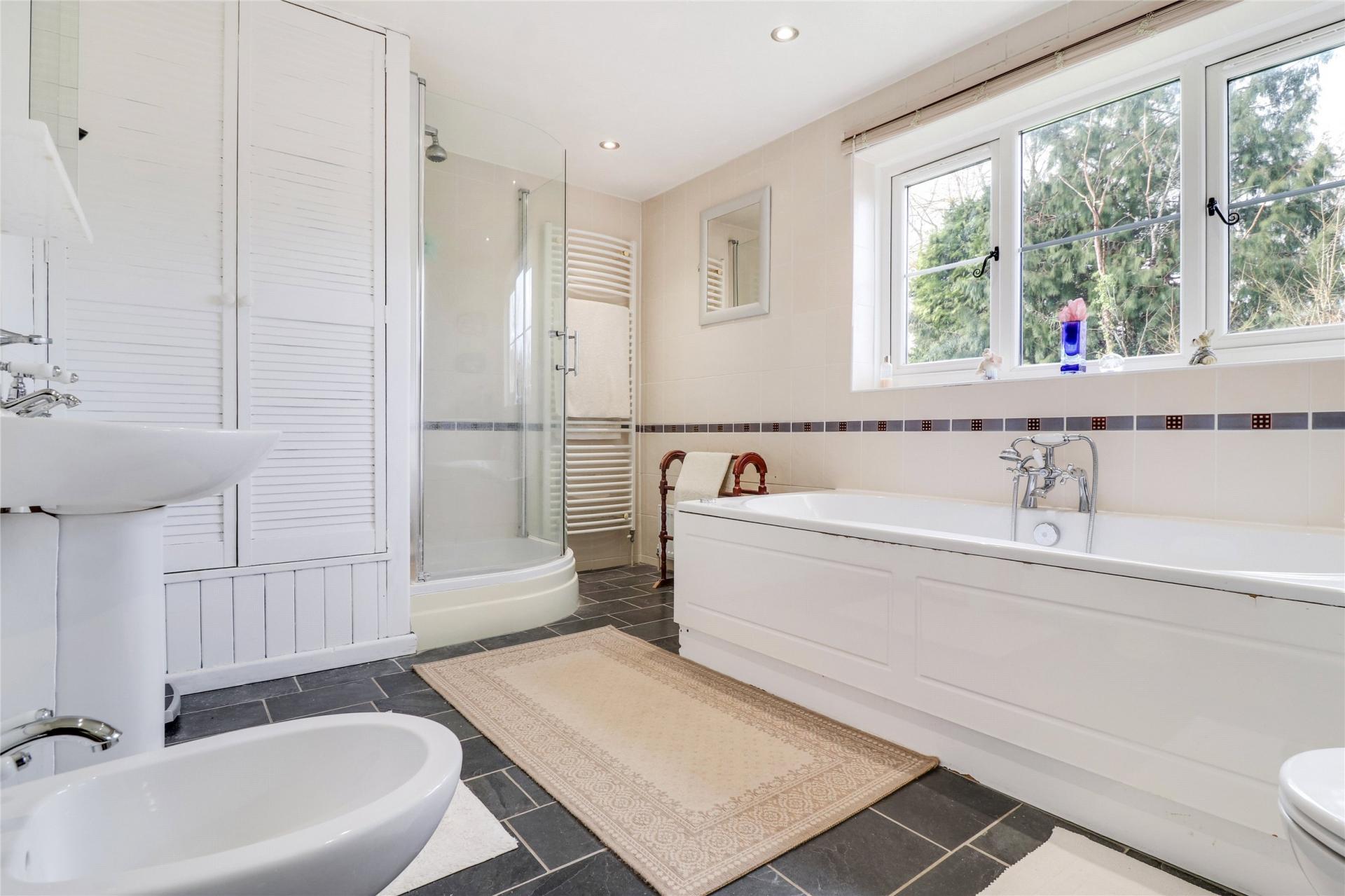To the first floor, the property offers four double bedrooms, all excellent in size and enjoying windows to the front elevation with an open outlook. The master bedroom is particularly impressive, featuring doors opening onto a balcony and a fully tiled en suite comprising a walk-in shower, WC, and his-and-hers wash basins. Off the landing, there is a four-piece family bathroom, along with a separate WC.