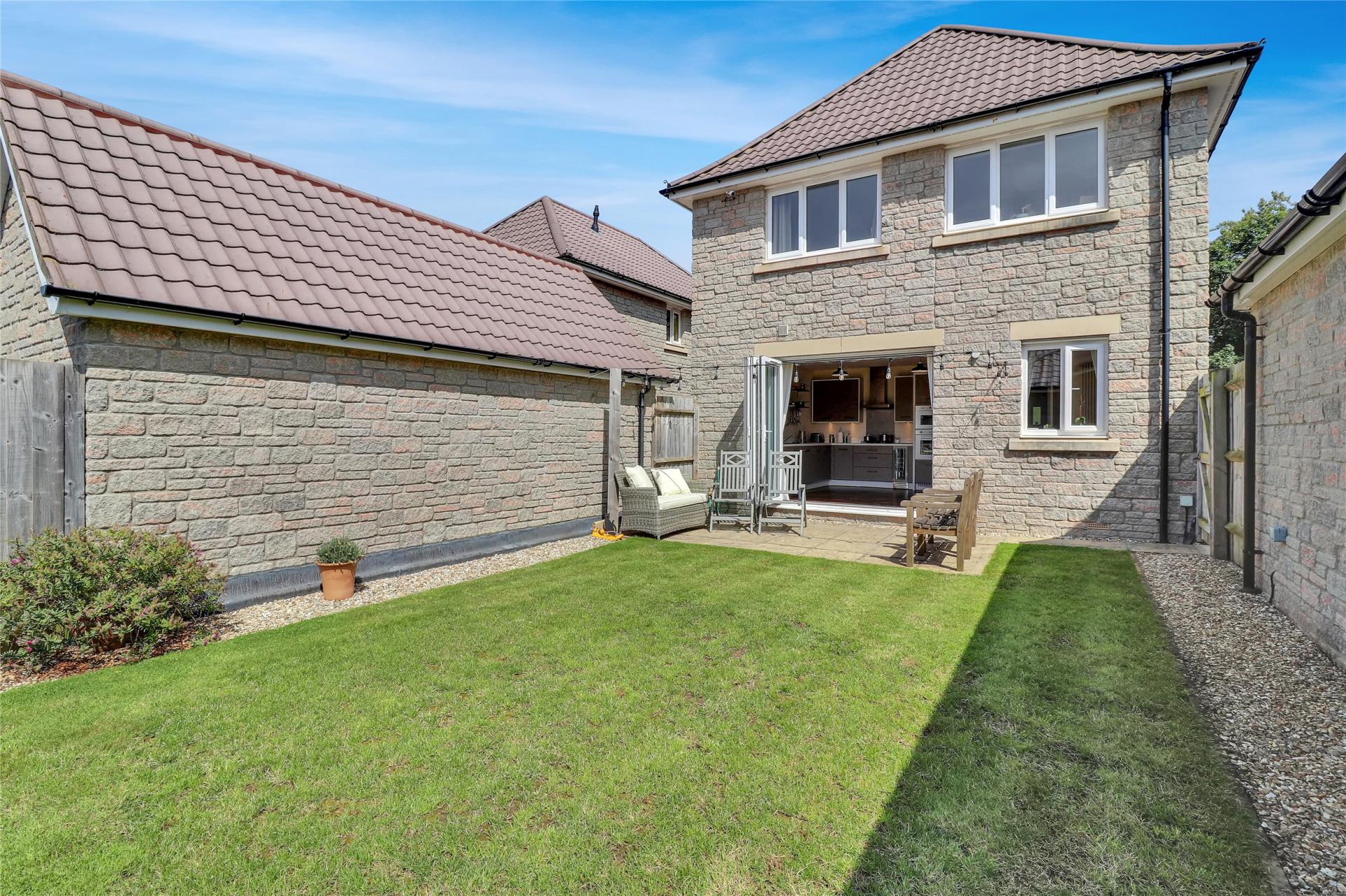 Moving through to the rear of the property, the spacious kitchen/diner provides a superb heart of the home. Well-appointed and thoughtfully arranged, it offers ample space for cooking, dining, and socialising, with French doors opening directly onto the enclosed rear garden. This outdoor space is neatly landscaped, featuring a combination of lawn and patio areas, ideal for al fresco dining or simply enjoying the sunshine. The garden also provides pedestrian gated access to the driveway, which offers parking for a couple of vehicles, and in turn leads to the detached single garage.