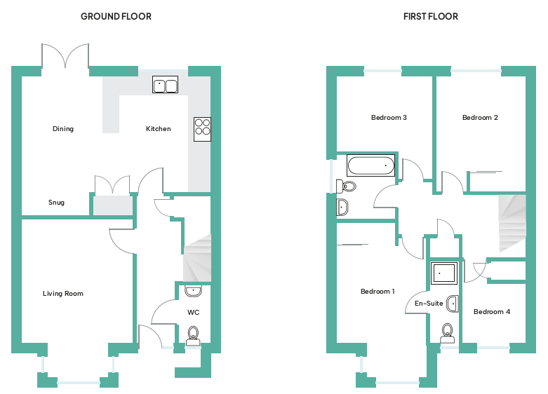A welcoming and spacious entrance hallway leads into the home and there is the immediate feeling of light and space. The heart of the home is the superb 22ft x 16ft kitchen/family room which is a perfect daytime living space for the modern family. The room stretches across the whole of the rear of the house and has a well-equipped and generous sized kitchen area, complete with modern units, Quartz work surfaces and integrated appliances including oven, induction hob, extractor, fridge/freezer, and dishwasher. There’s ample space for a family dining table, perfect for mealtimes and entertaining. Furthermore, The Teal has a new feature for phase 2, with a slight tweak to the design, there is now additional space in the kitchen/livingroom which provides an additional snug area with space enough for a sofa, making the room more of an all-day comfortable living space. There is a seamless connection between indoor and outdoor living with double doors opening directly onto the sun terrace and rear garden – ideal for relaxing evenings or summer days outdoors.