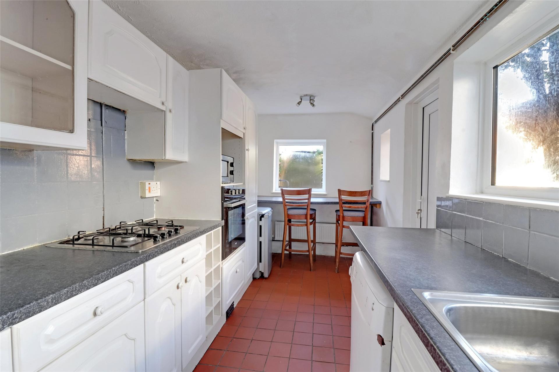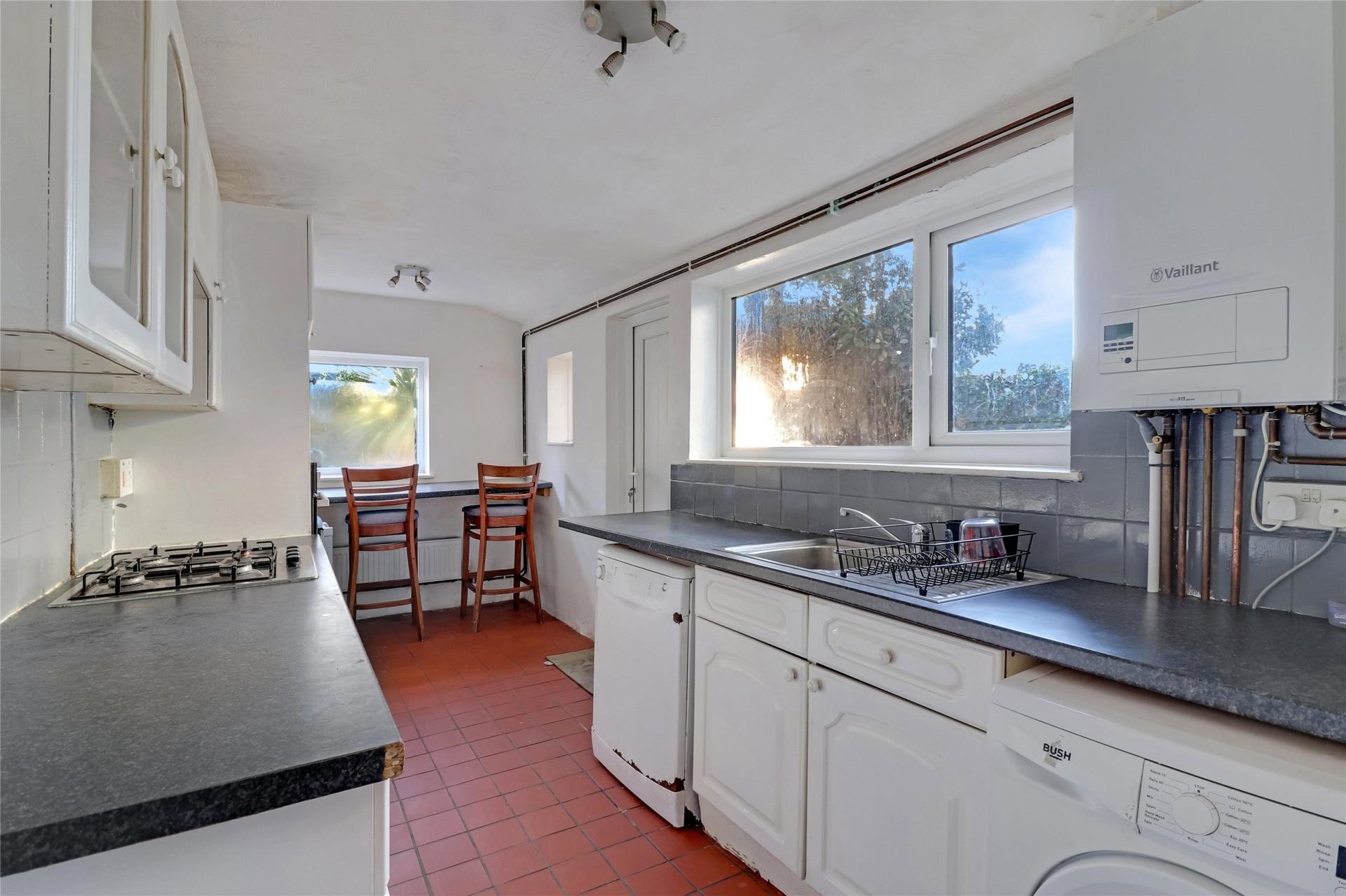 The fitted kitchen is well-appointed with ample worksurfaces, a range of wall and base units, integrated oven and gas hob, plus a useful breakfast bar overlooking the garden. A side door provides convenient access to the outdoor space.