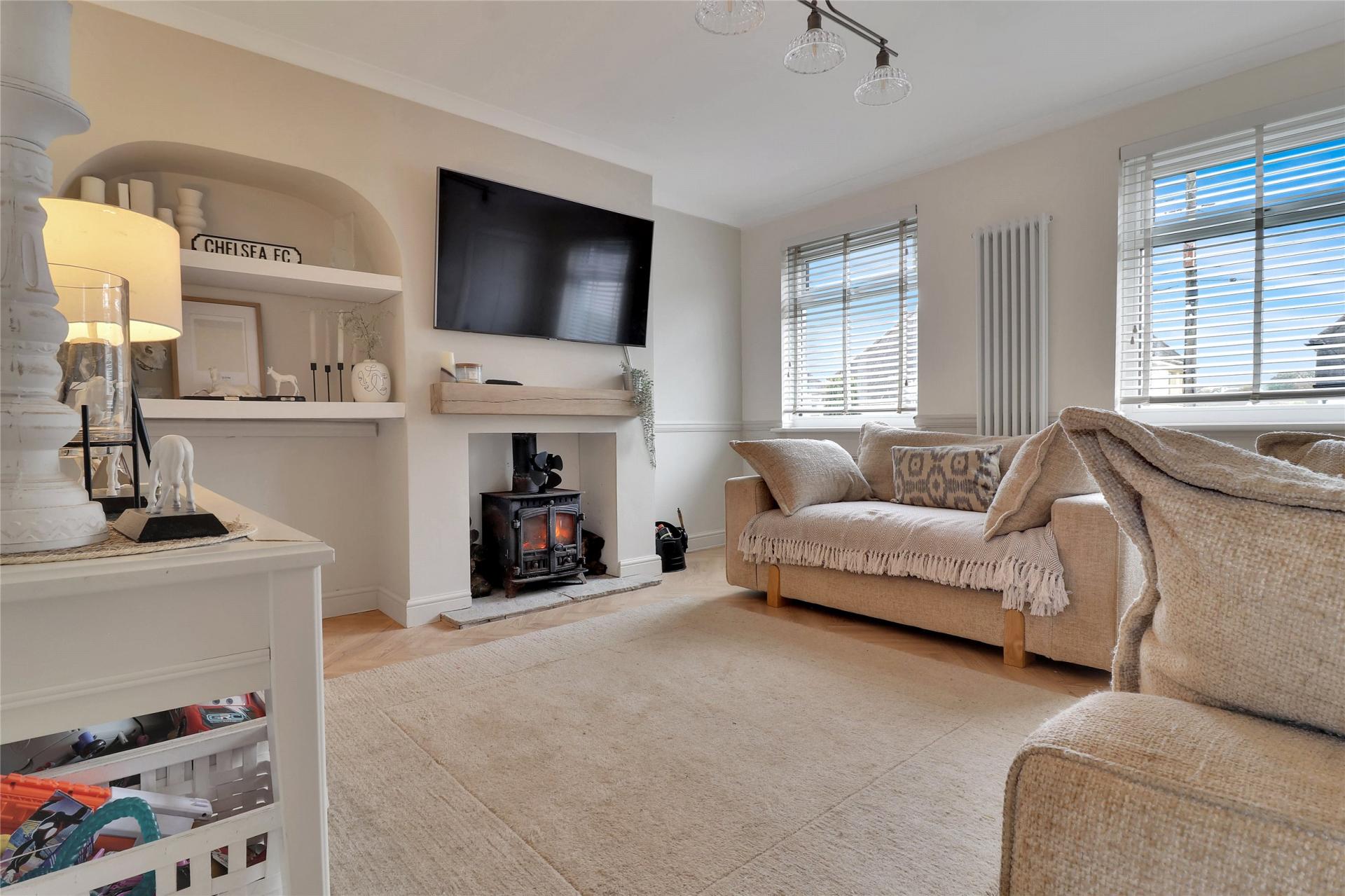 Upon entering the property, the main hallway provides access to the ground floor living room and stairs leading to the first floor. The living room is generously proportioned and enjoys pleasant views through two windows to the front elevation. A tastefully updated feature fireplace serves as a charming focal point, featuring a wood burner.