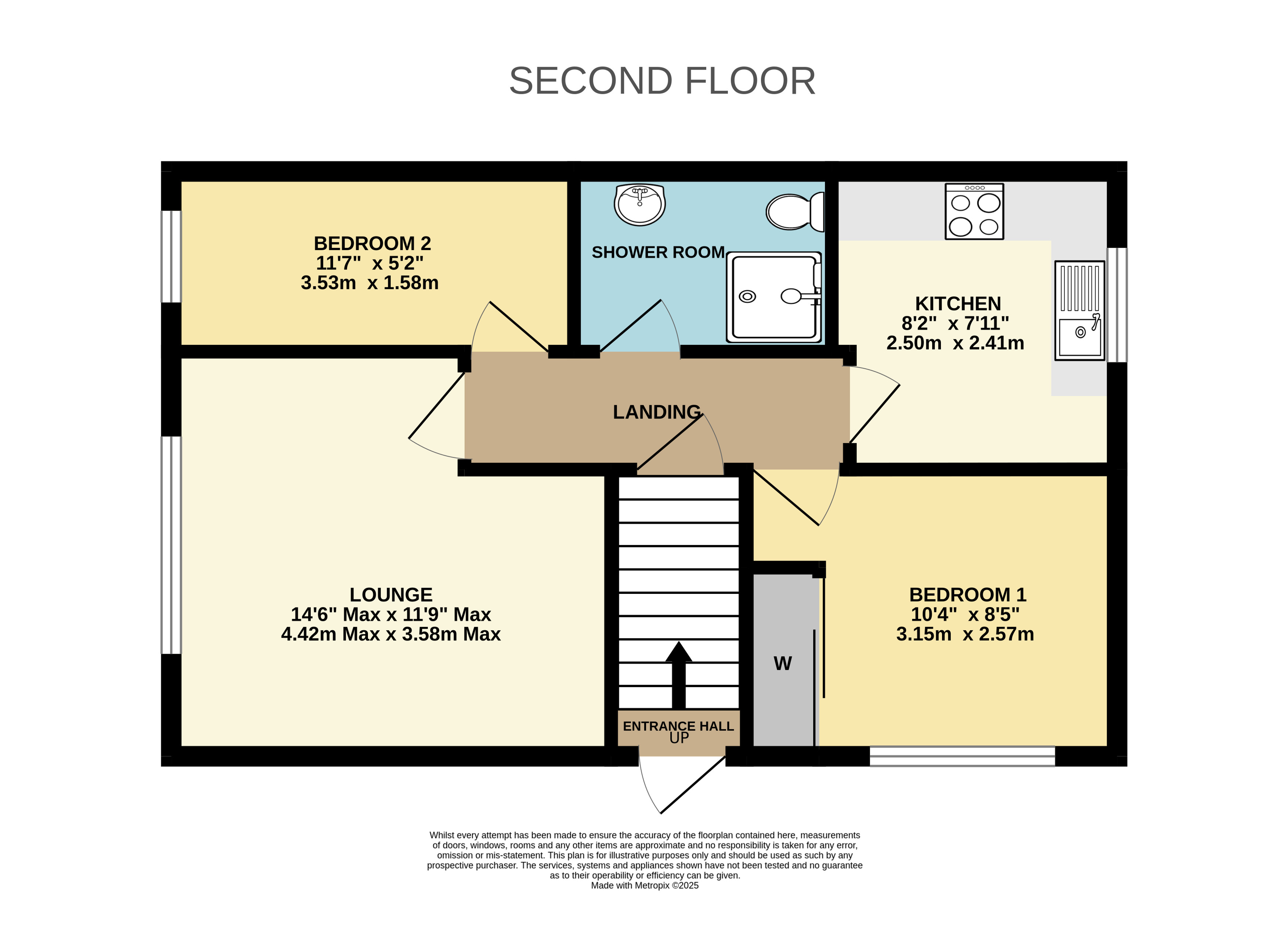 The main bedroom is a well-sized double with built-in wardrobes, while the second bedroom provides a generous single. Both rooms are served by a contemporary shower room complete with a shower enclosure, low-level WC, and hand basin.