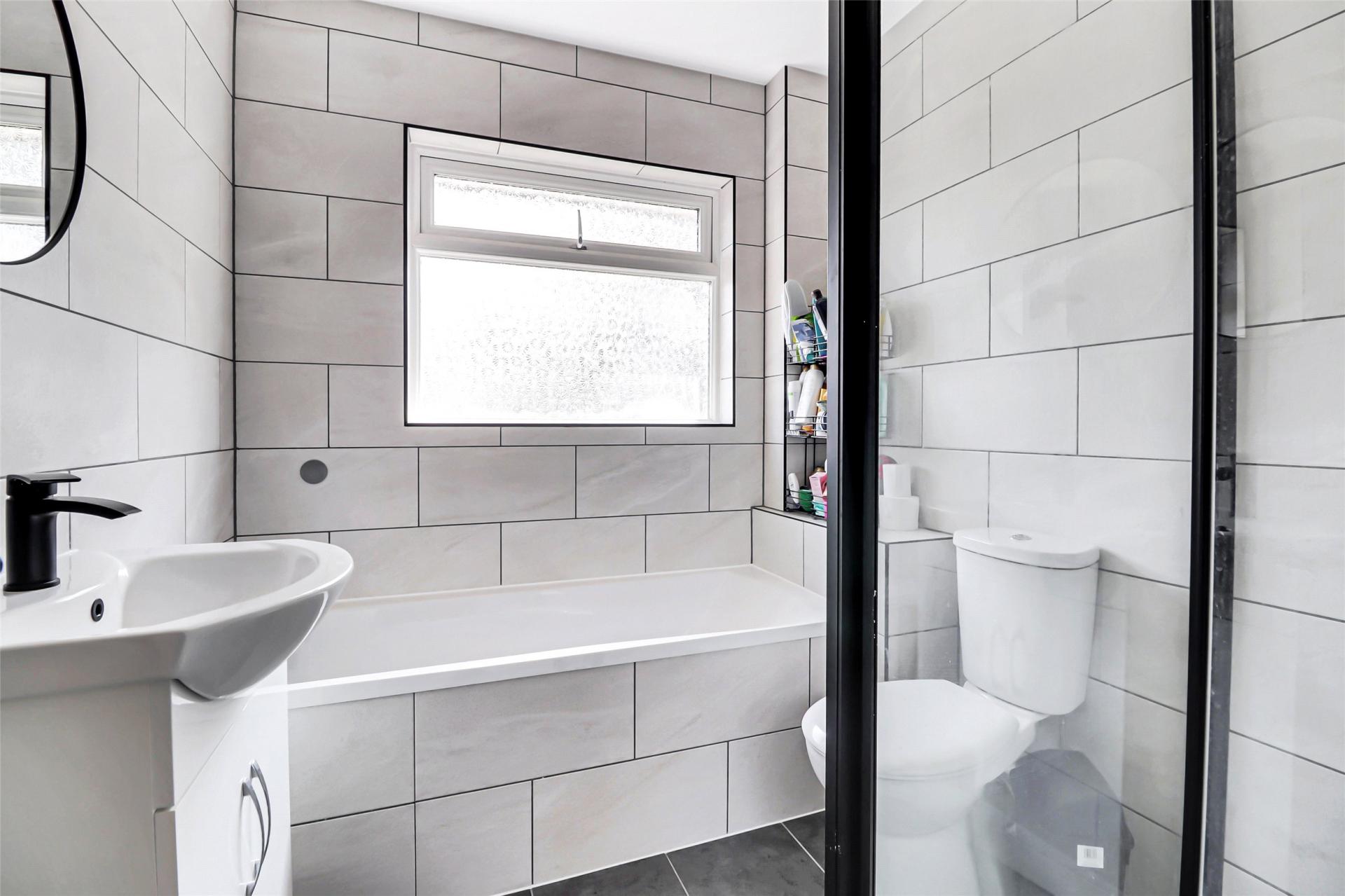 Upstairs, there are two generous double bedrooms, including a particularly impressive main bedroom with dual aspect windows and built-in storage. The newly fitted modern bathroom includes a sleek four-piece suite, offering both a bath and separate shower.