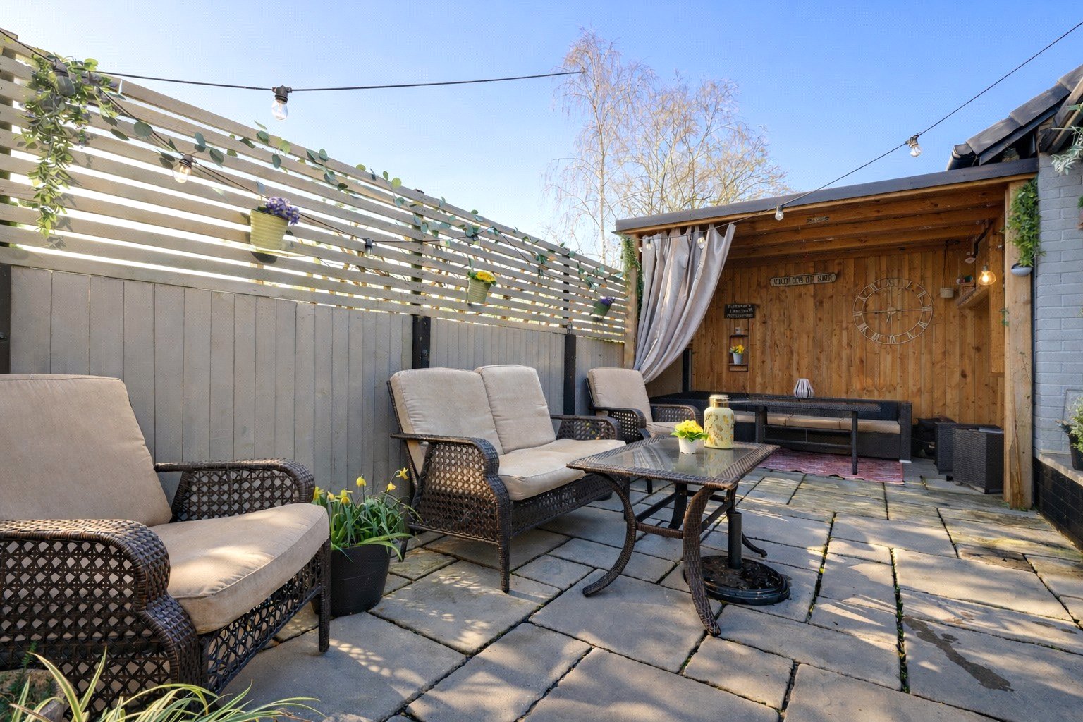 The rear garden has been thoughtfully arranged to create distinct areas for relaxation and entertaining. Immediately accessed from the dining area is a private patio, perfect for outdoor dining. The current vendors have also created a snug seating area, ideal for enjoying warm summer evenings. Steps lead down to a further enclosed lawned garden, offering a private and secure space for children or pets. A side pedestrian gate provides access to an additional garden area, which wraps around to the front of the property.