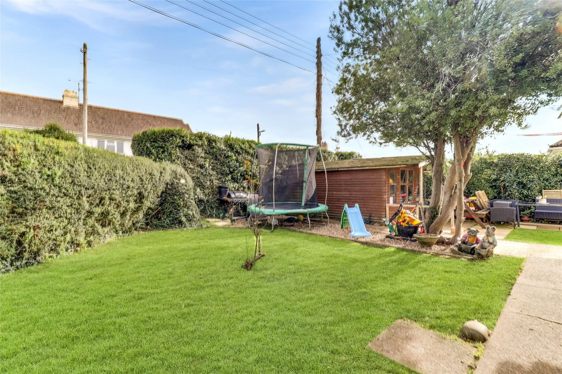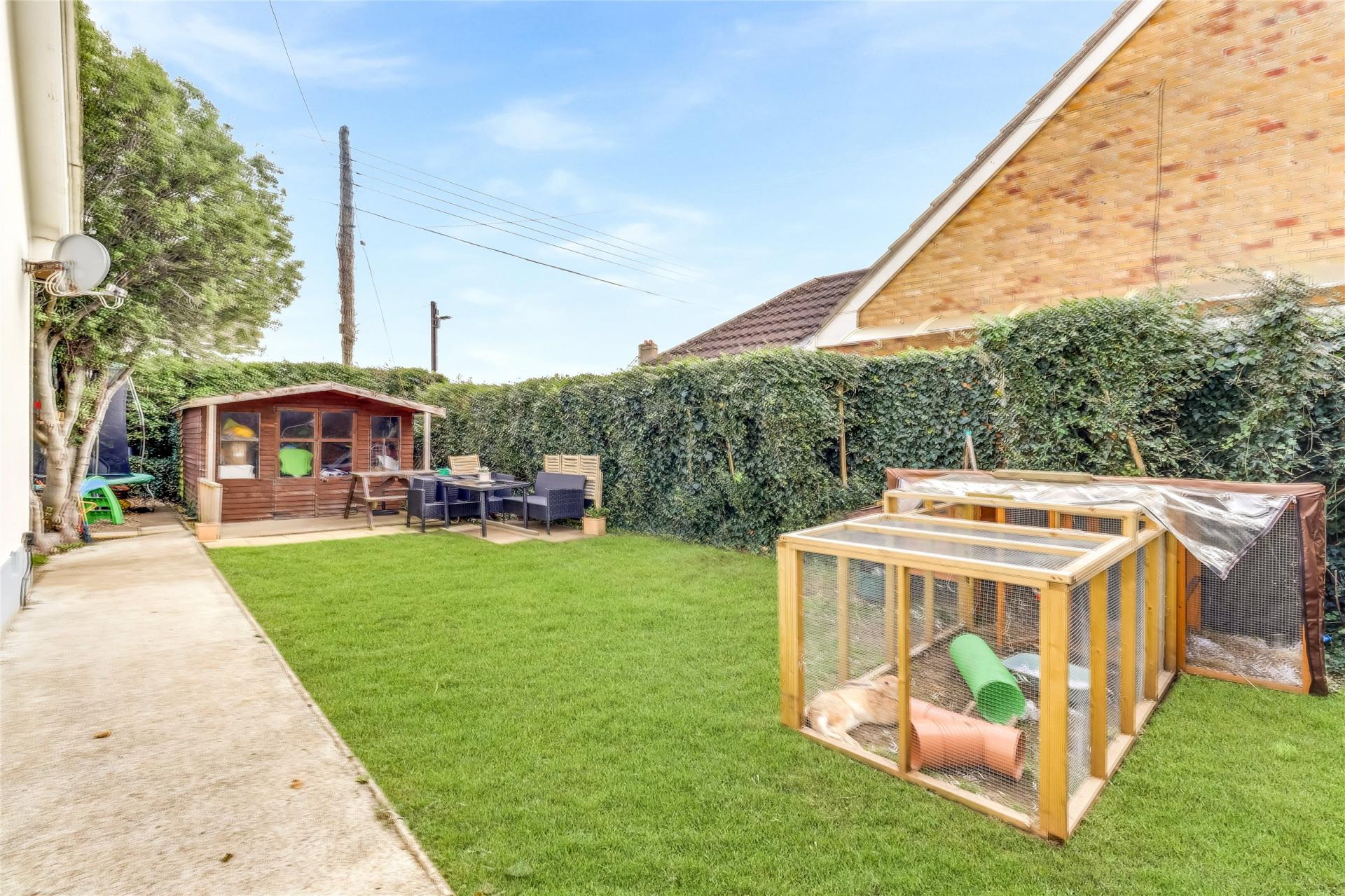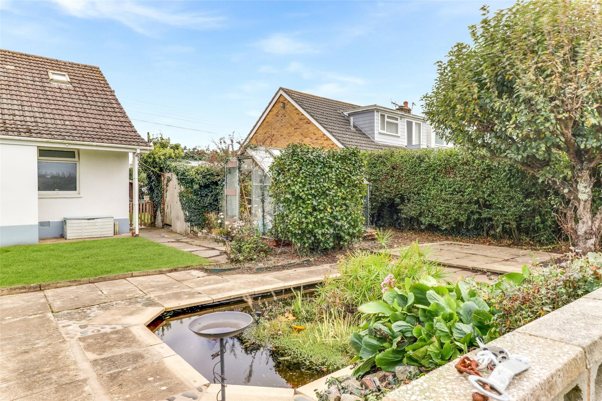 Outside, there is a large off-road parking area suitable for several vehicles, including motorhomes, along with a gated driveway providing parking for two further cars, leading to a large double garage with an up-and-over door and store room. The garden wraps around the property and comprises lawned areas, a pond and patio spaces, offering further scope for enhancement. Available with no onward chain.