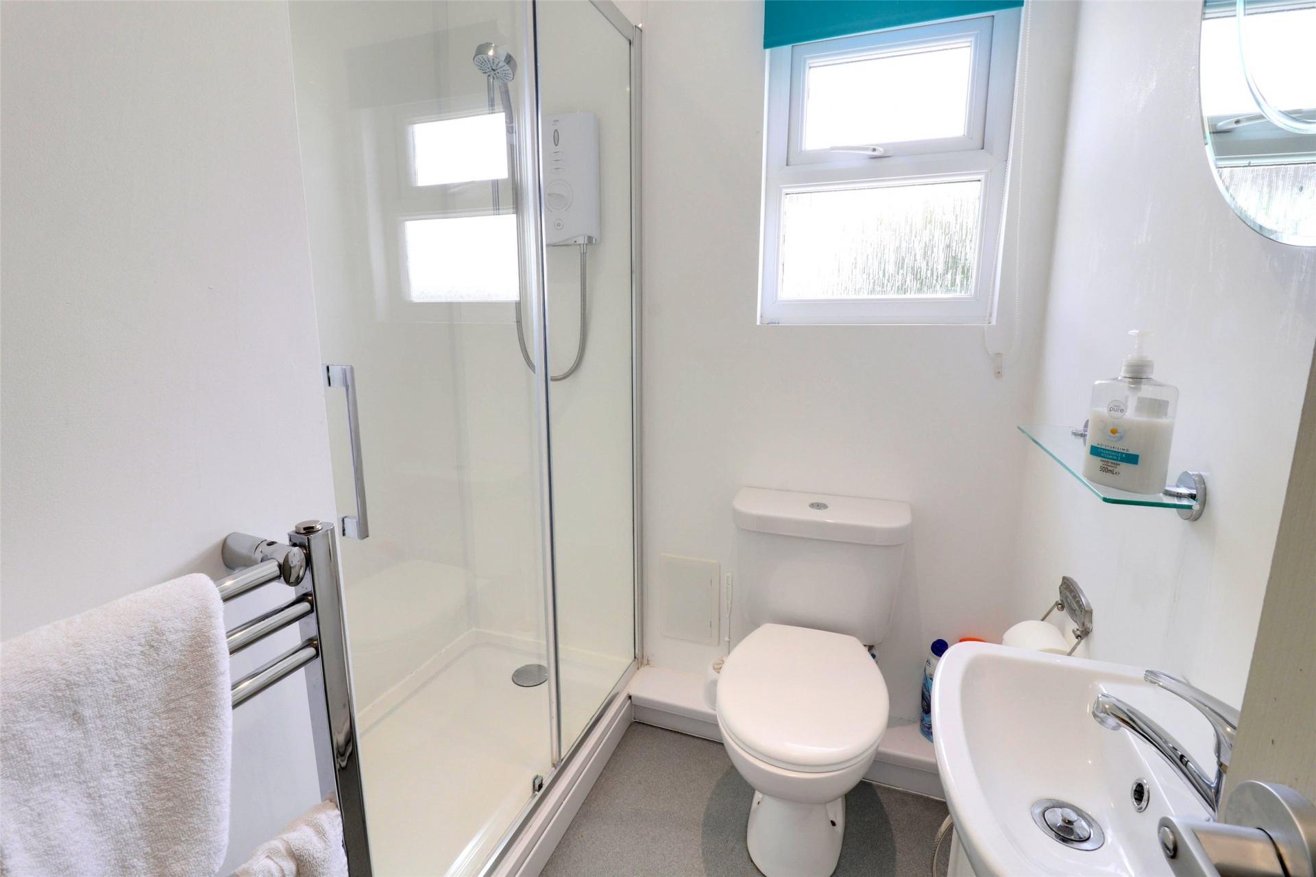 A clean and simple neutral-toned shower room includes a walk-in shower, toilet and hand wash basinideal for rinsing off after a day exploring the nearby coastline.