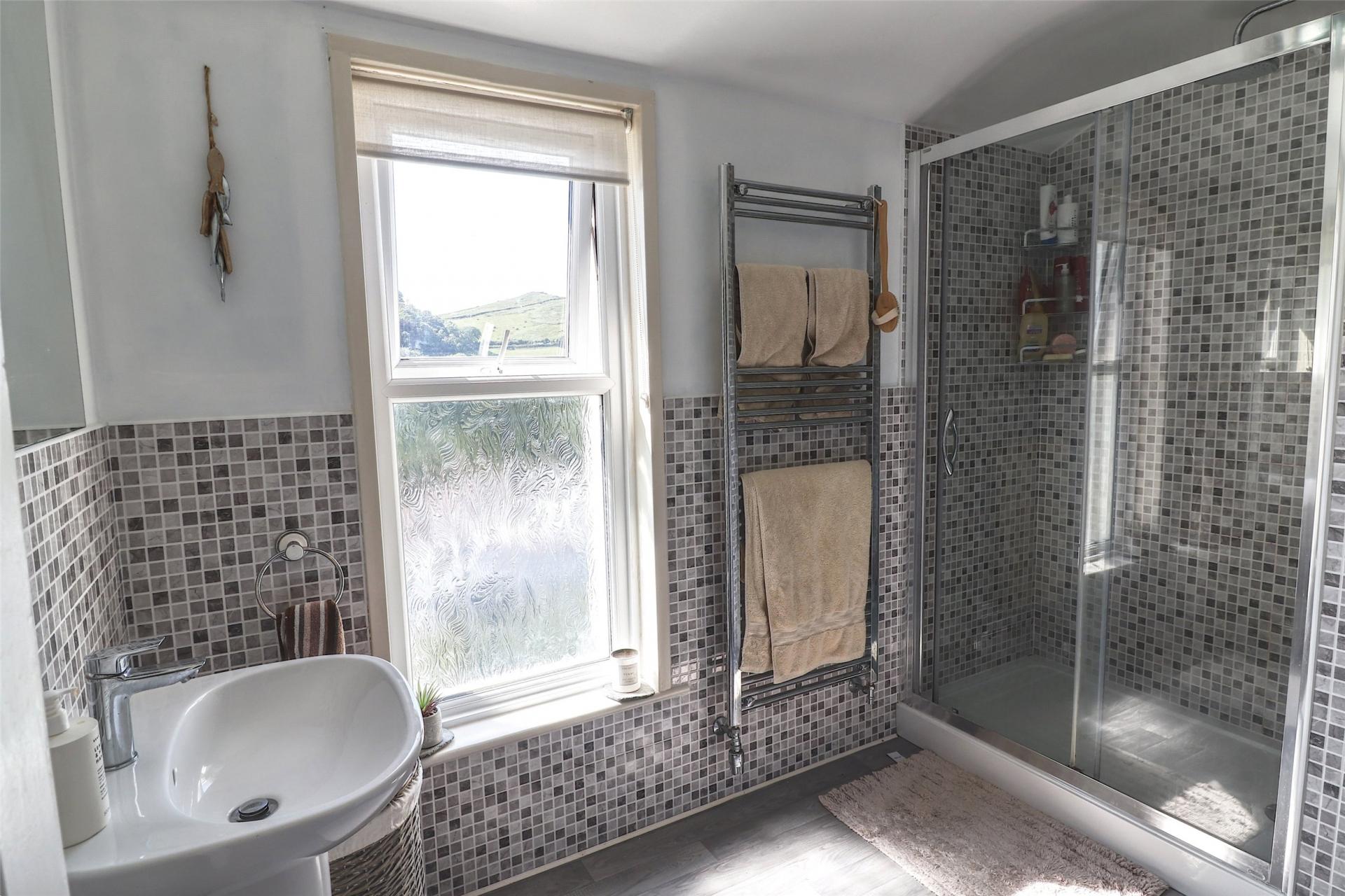 The ground floor living accommodation comprises of an entrance hallway with tiled flooring, stairway leading to the first floor and has doorways leading off to the principle rooms. The living room is flooded with natural light, but also features a large bay window to the front elevation, log fireplace and lovely high ceilings. The dining room is again a naturally bright and elegant room which provides the perfect space for a dining table and chairs. The kitchen is in very good order and is located at the rear of the property. The room is equipped with a range of base and eye level units and matching drawers, built in electric oven with a four ring gas hob and stainless steel extractor hood over. The kitchen enjoys a delightful view over the garden and towards the National Trust owned Torrs. Furthermore from the kitchen, there is a very useful utility space with ample cupboard storage and space for both washing machine and tumble dryer.