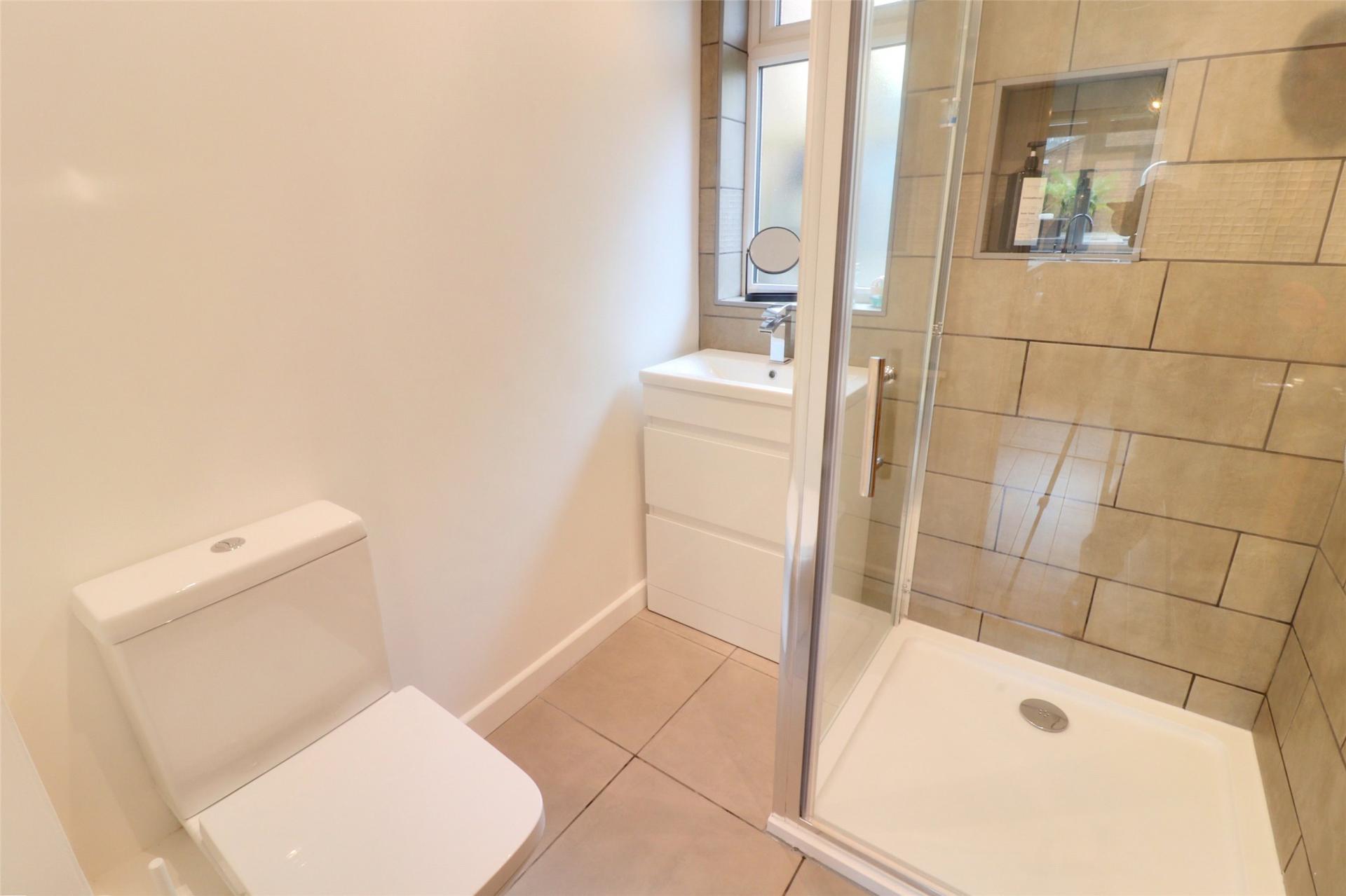 The recently renovated shower room boasts a walk-in shower cubicle with floor-to-ceiling tiles, a vanity unit with an inset sink, and a low-level WC, all finished to a high standard.