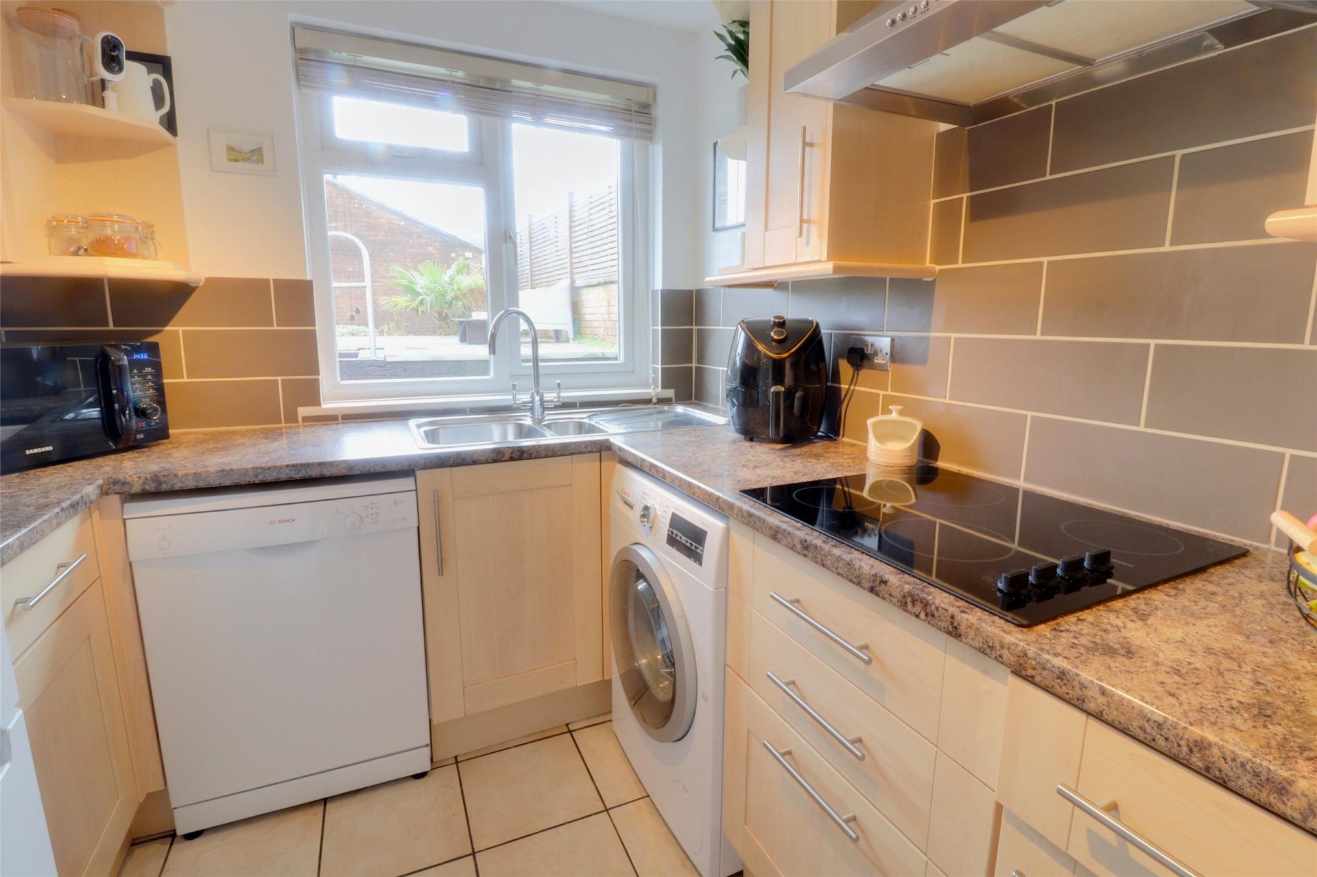 The modern kitchen is equipped with a range of wall and base units, complemented by a stylish tiled splashback. It offers space and plumbing for a washing machine, dishwasher, and fridge/freezer, as well as an integrated electric hob and oven.