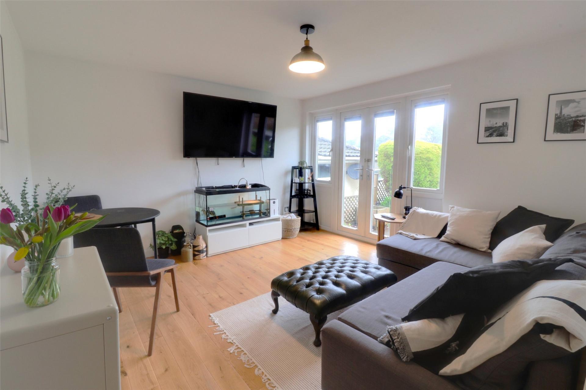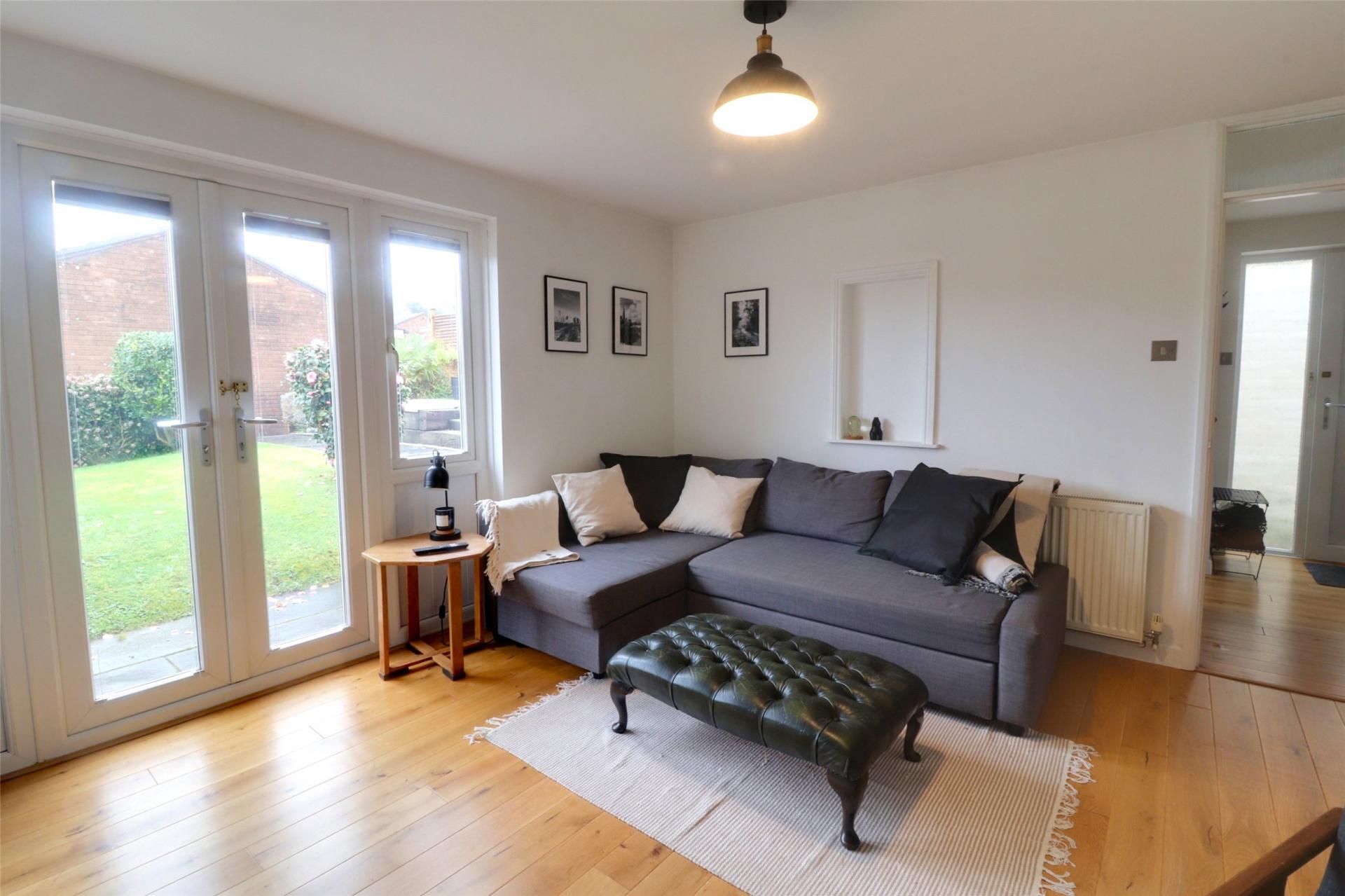 Upon entering, the entrance hall provides access to all key rooms, including a convenient storage cupboard that houses the recently upgraded gas combination boiler. The spacious living room is filled with natural light thanks to large uPVC French doors, creating a bright and airy space. With room for a dining table and low-maintenance wood flooring, it's an ideal spot for relaxation, unwinding, and entertaining guests.