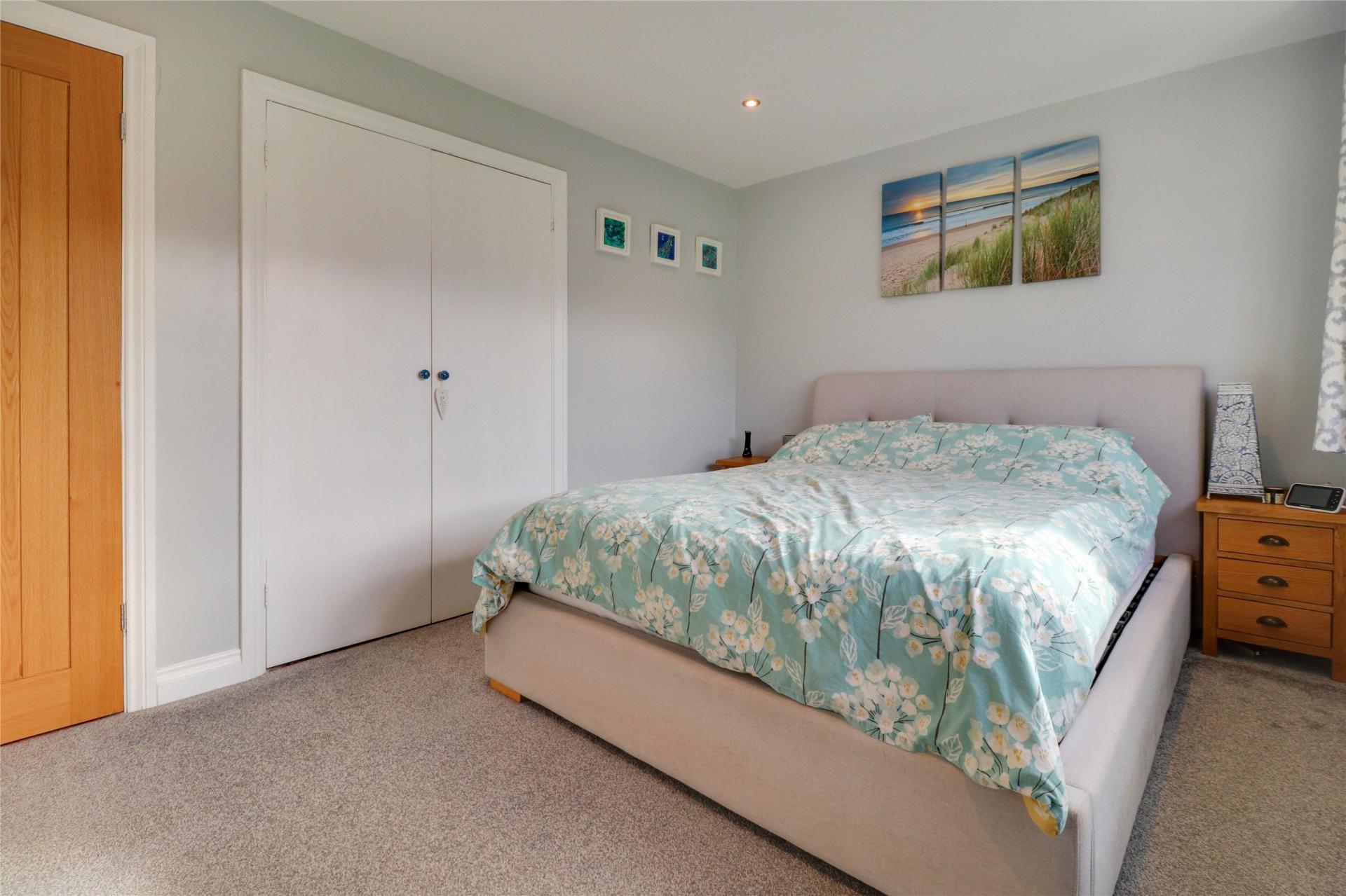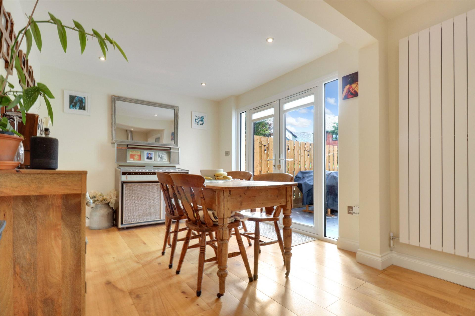 To the rear is the standout feature: a stunning kitchen and dining room. This space is equipped with stylish matching wall and base units, room for a large dining table, double doors opening to the rear garden, and elegant engineered oak flooring. Adjacent to the kitchen, a functional utility room includes plumbing for appliances, coat and shoe storage, and an additional door to the garden.