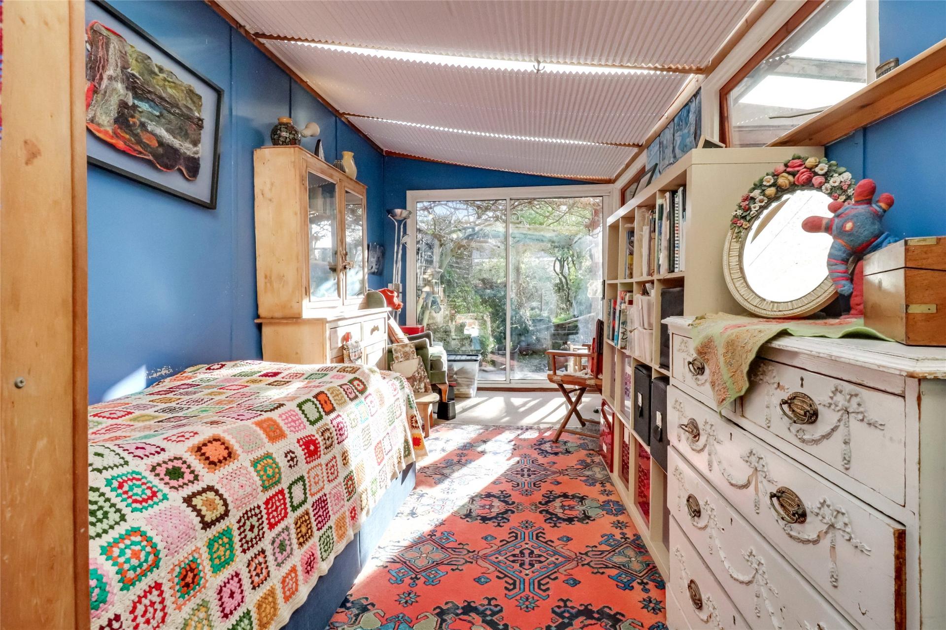 A door from the lounge leads through the rear porch and down a few steps to a partially covered lean-to area, which provides useful storage space and access to the garden room, currently used by the vendor as an additional bedroom, together with a shower room to the rear. Sliding doors from this room open out to lovely views of the pretty rear garden.
