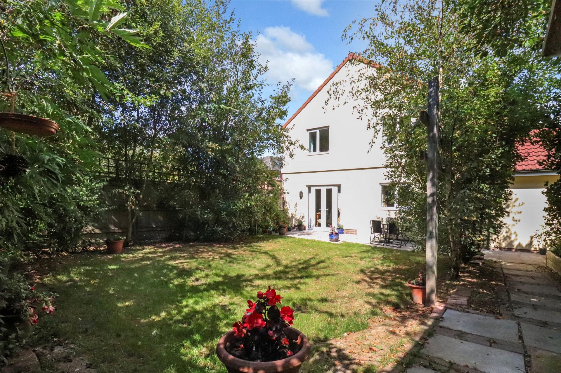 The rear garden is generously sized, featuring a patio area just beyond the back doors, a large lawn bordered by mature shrubs and trees, and a pathway to the garage. The garage is equipped with power and lighting and there is side access to the garden.